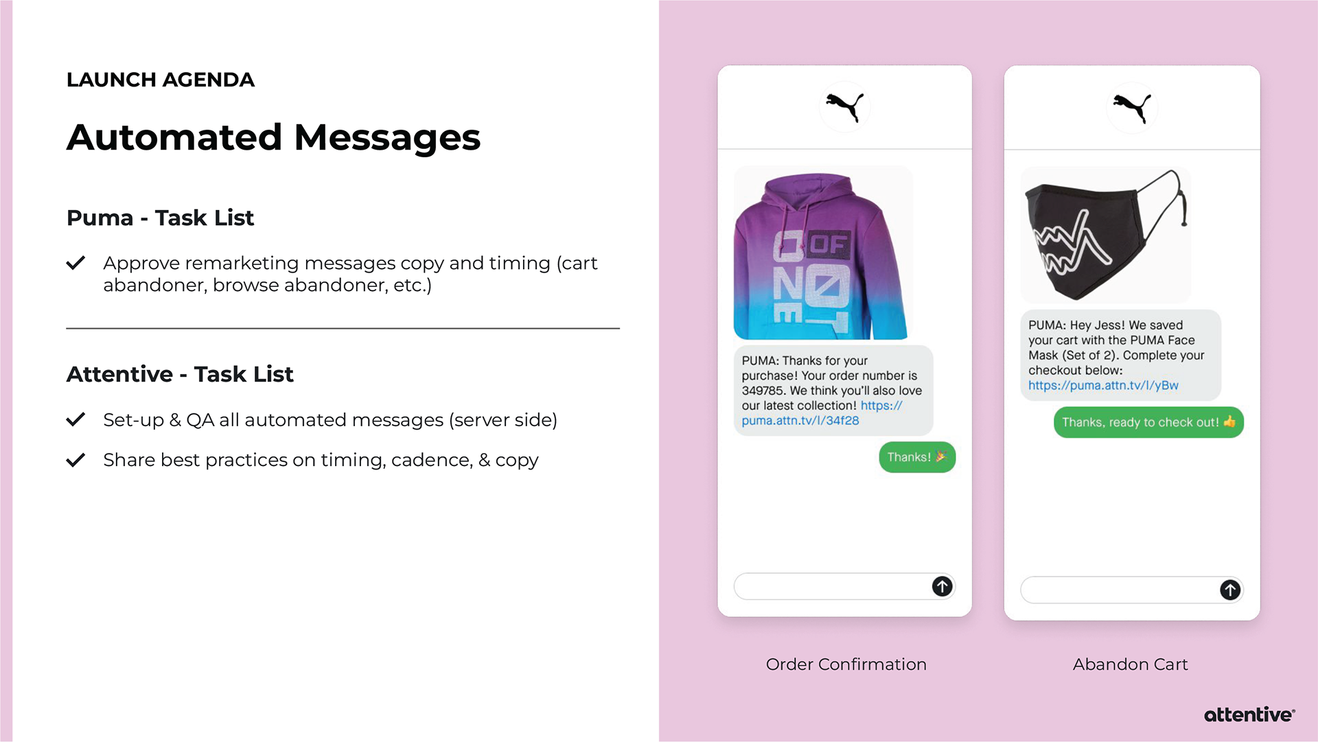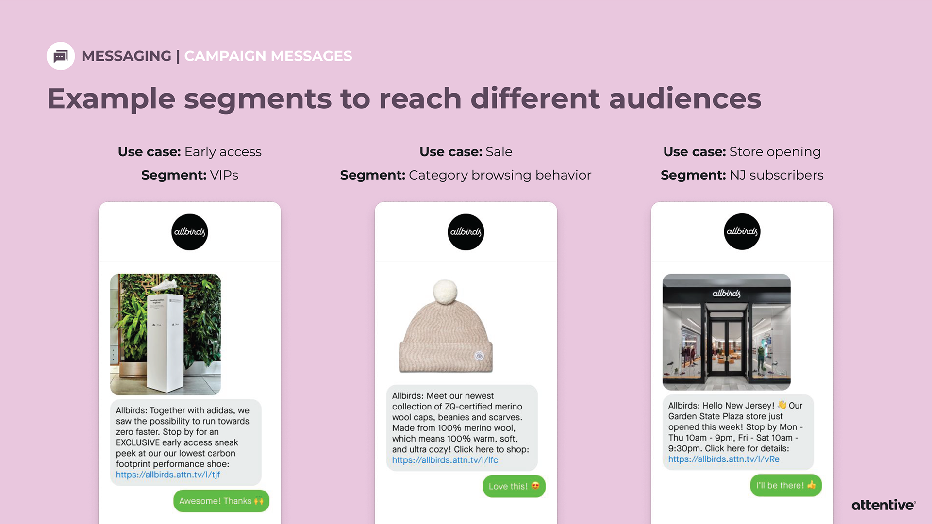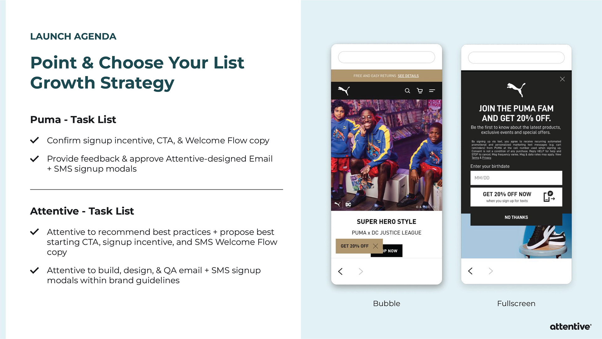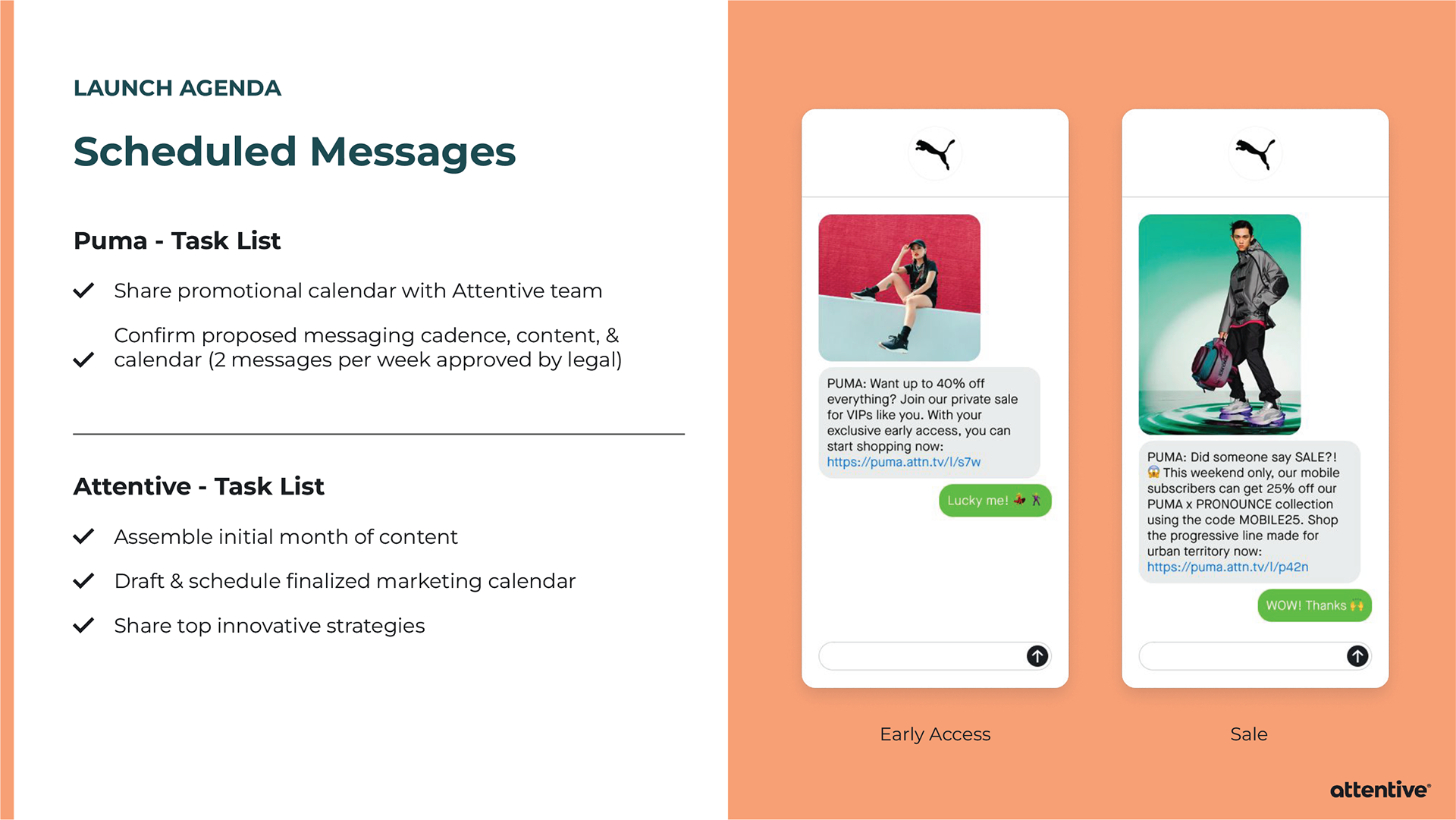 When pitching Attentive to a potential client, sometimes the Sales team will provide an extensive slide deck tailored towards that individual company. Strategic Design is asked to provide custom mockups for the slide deck, and then it’s all up to Sales. I’ve created mockups for Allbirds, PUMA, and Sony Entertainment Pictures.