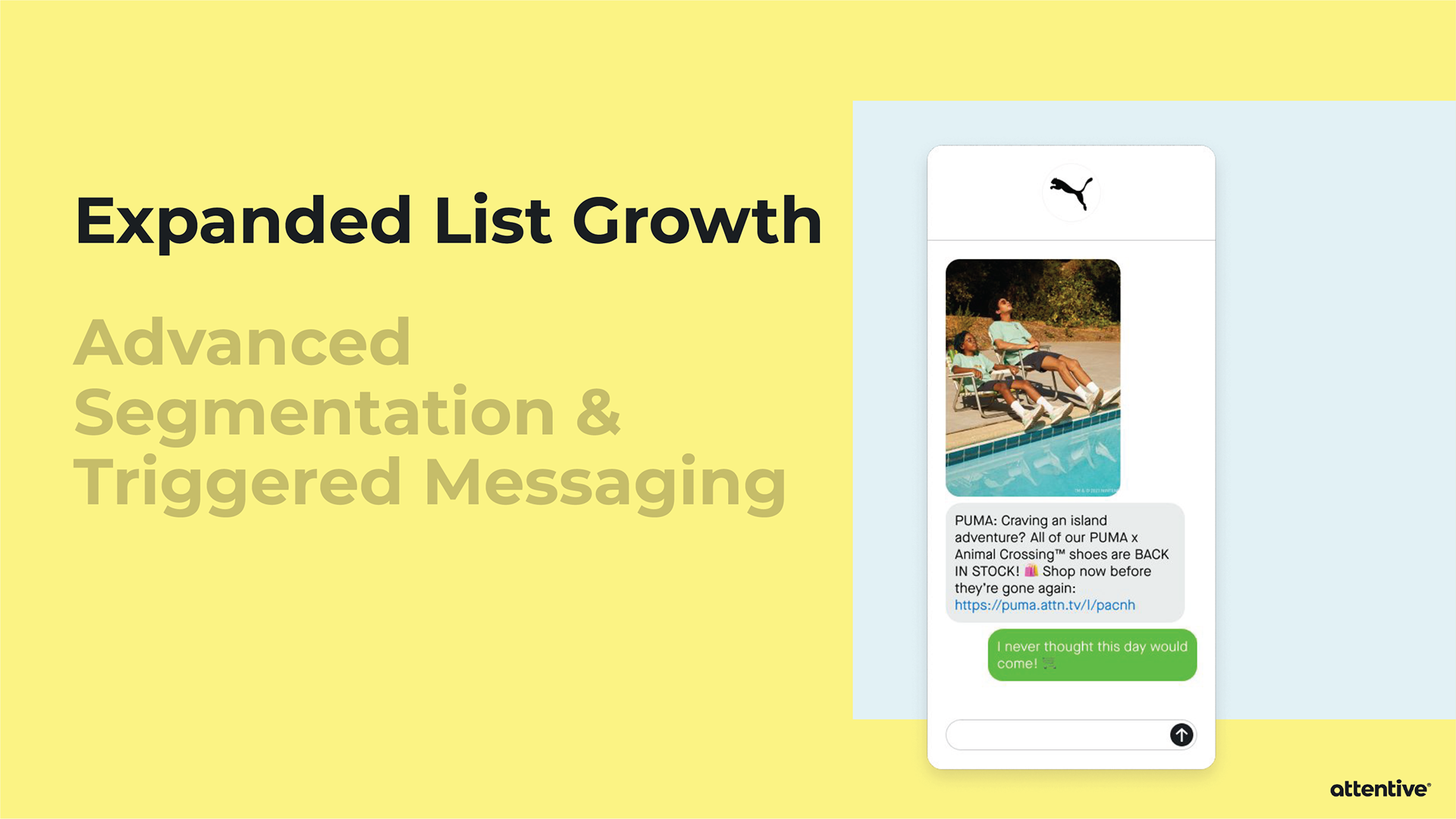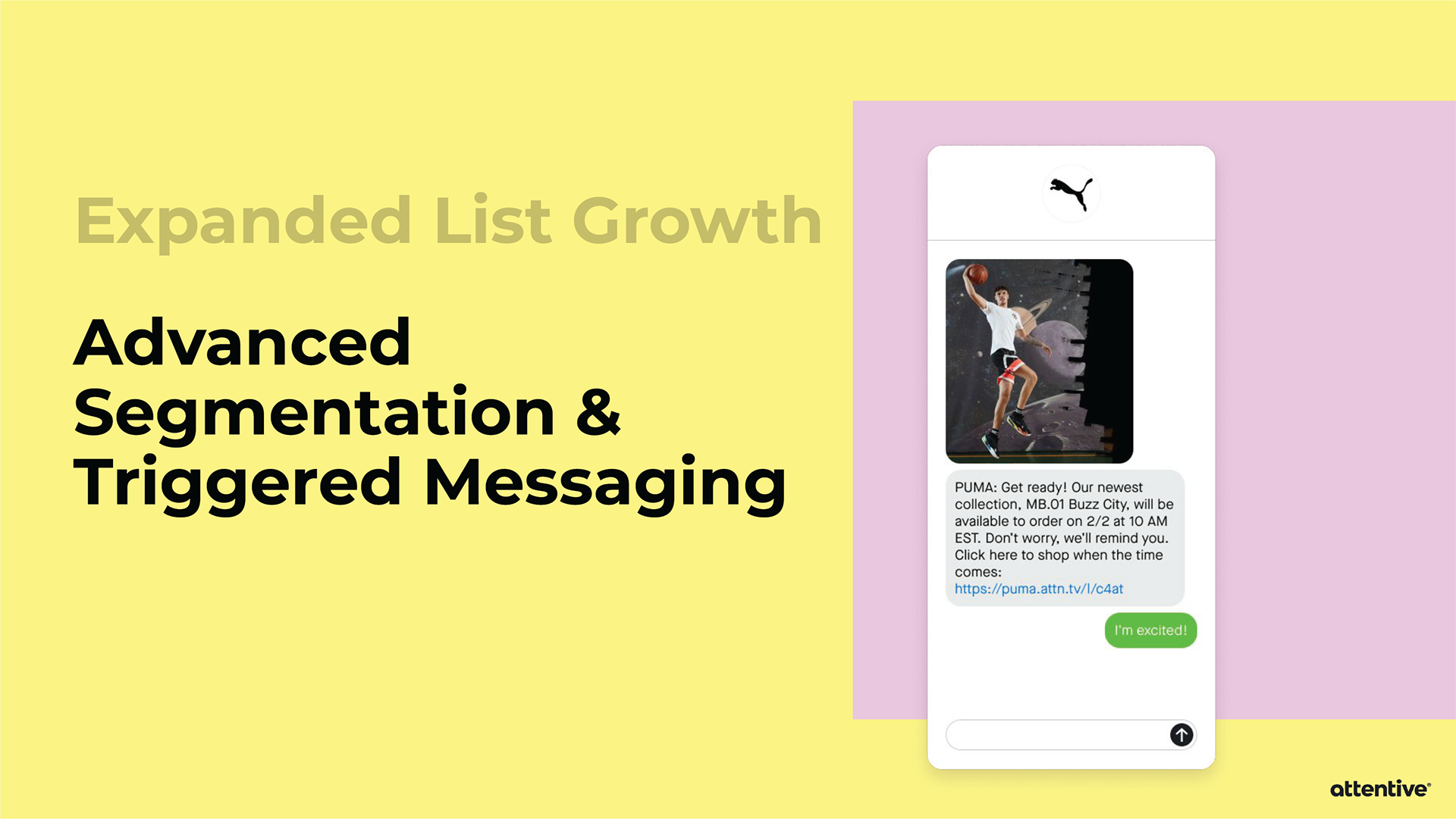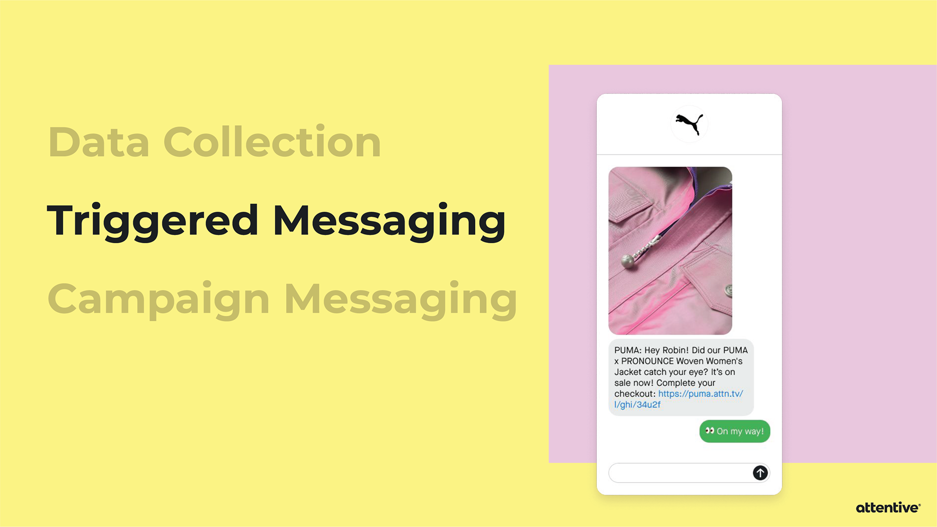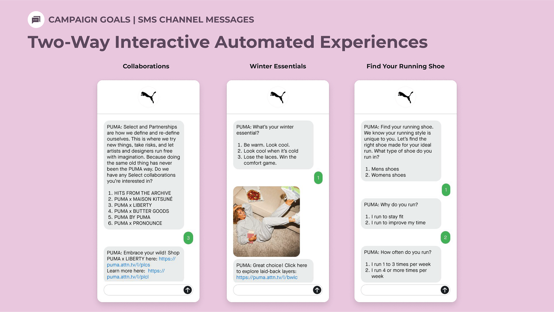When pitching Attentive to a potential client, sometimes the Sales team will provide an extensive slide deck tailored towards that individual company. Strategic Design is asked to provide custom mockups for the slide deck, and then it’s all up to Sales. I’ve created mockups for Allbirds, PUMA, and Sony Entertainment Pictures.
