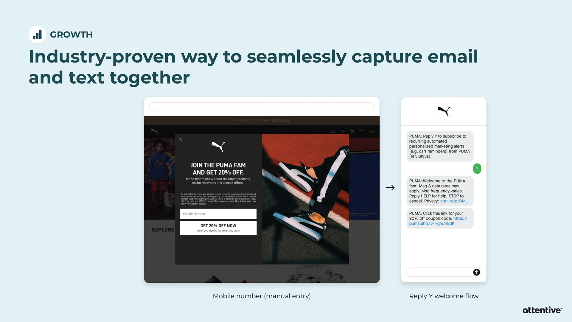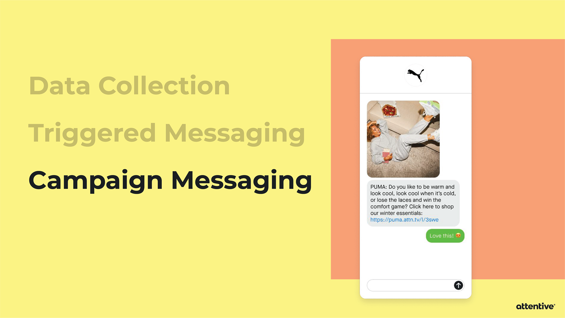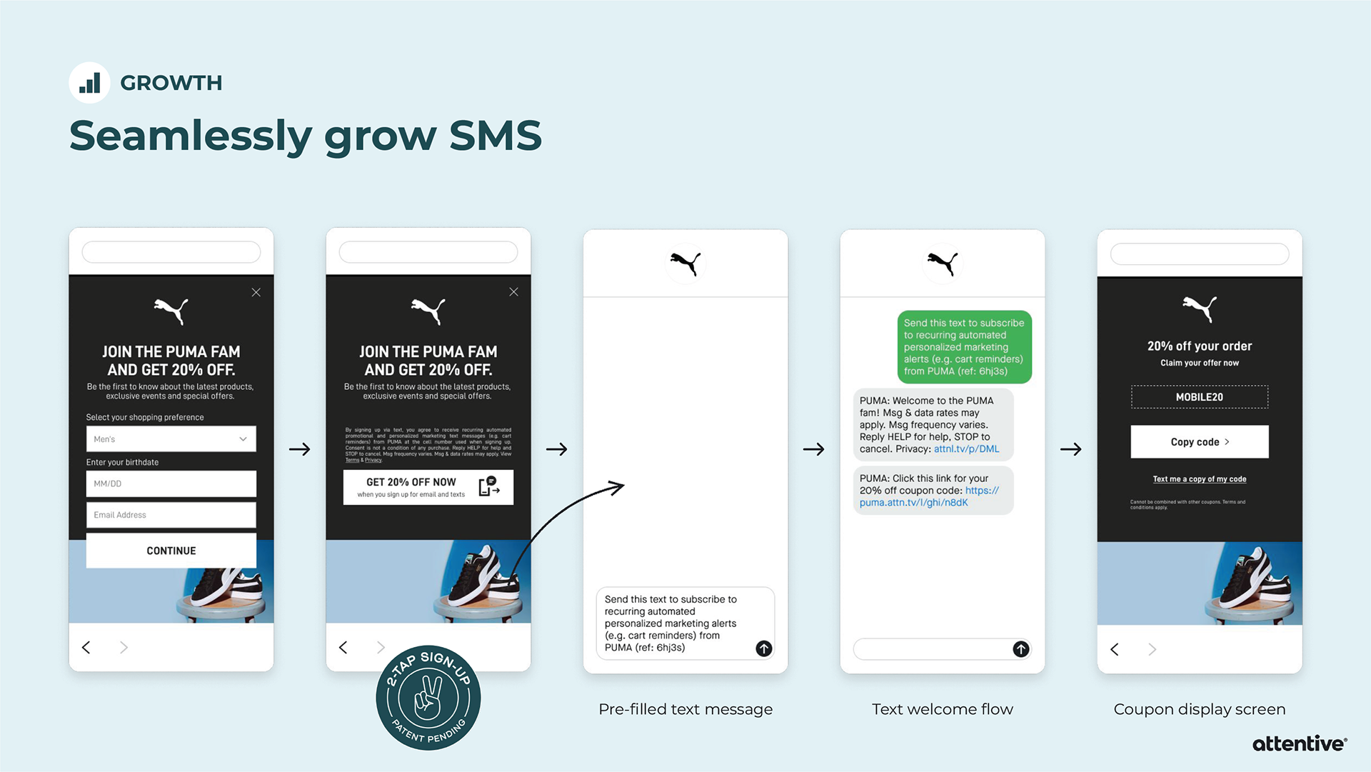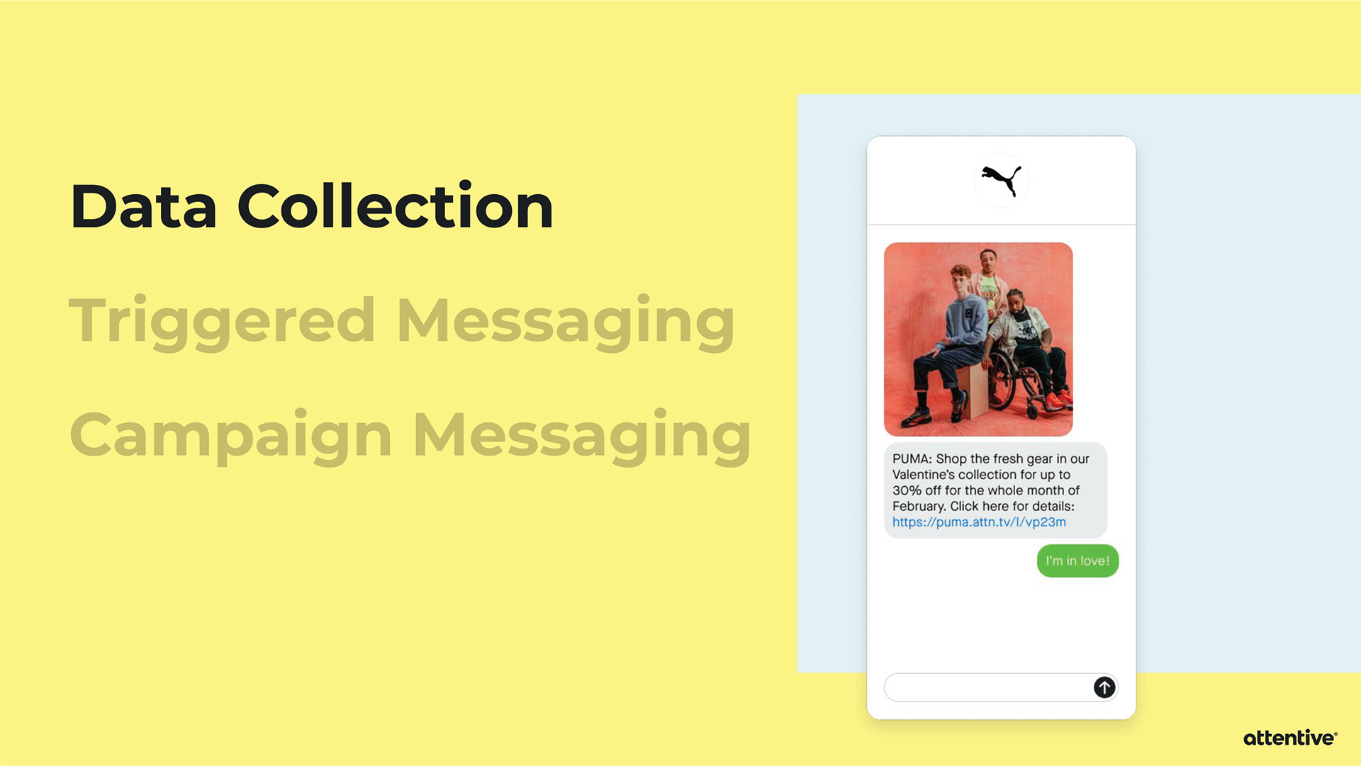 When pitching Attentive to a potential client, sometimes the Sales team will provide an extensive slide deck tailored towards that individual company. Strategic Design is asked to provide custom mockups for the slide deck, and then it’s all up to Sales. I’ve created mockups for Allbirds, PUMA, and Sony Entertainment Pictures.