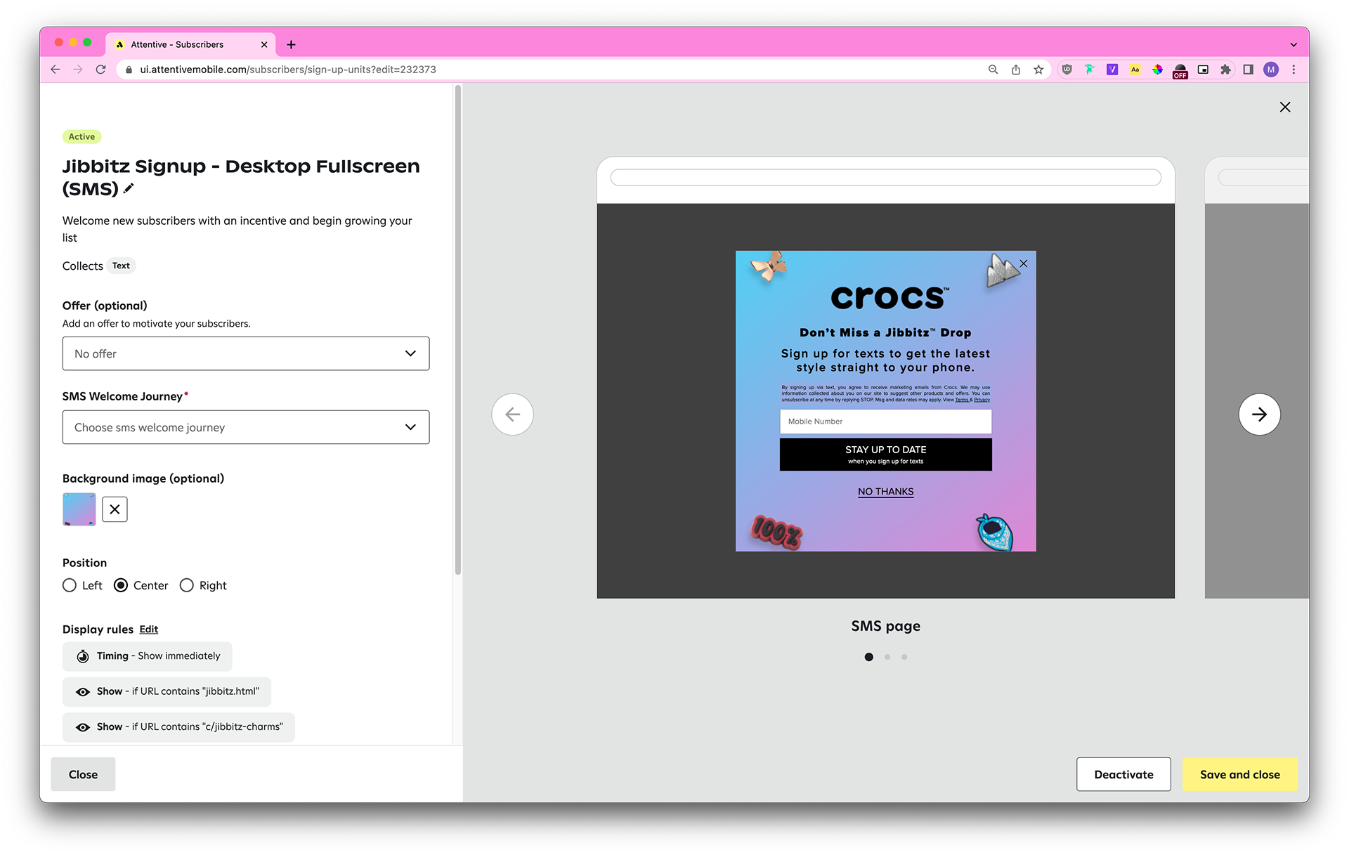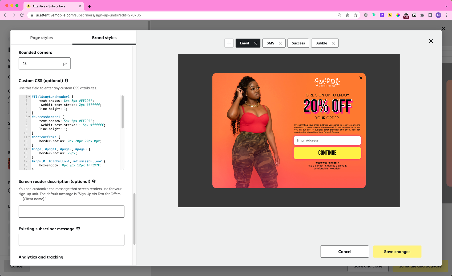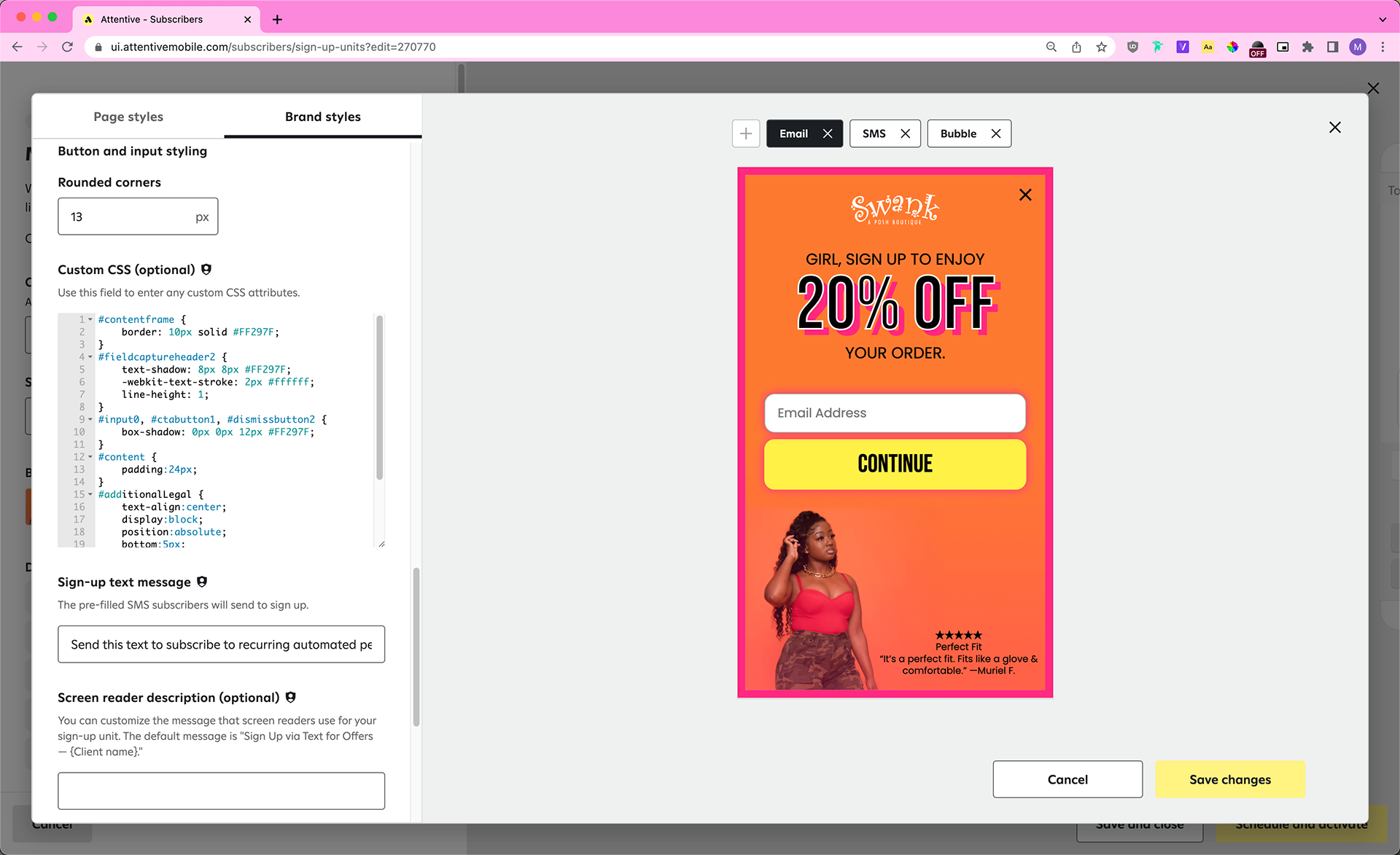 Five months later, I’m happy to say that Swank a Posh is still a client of Attentive (as of October 2022) and is currently utilizing our new spin to win sign-up units (not pictured).