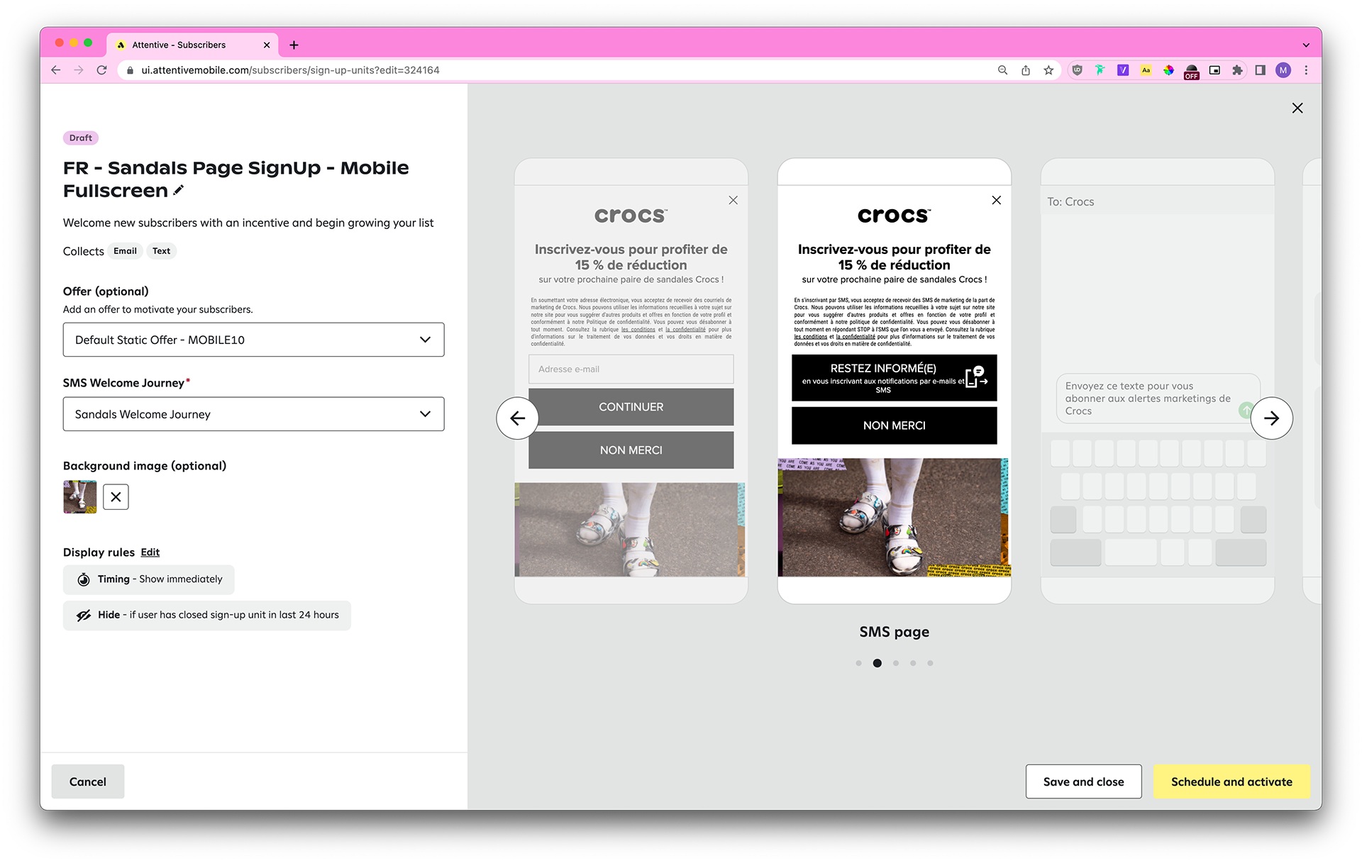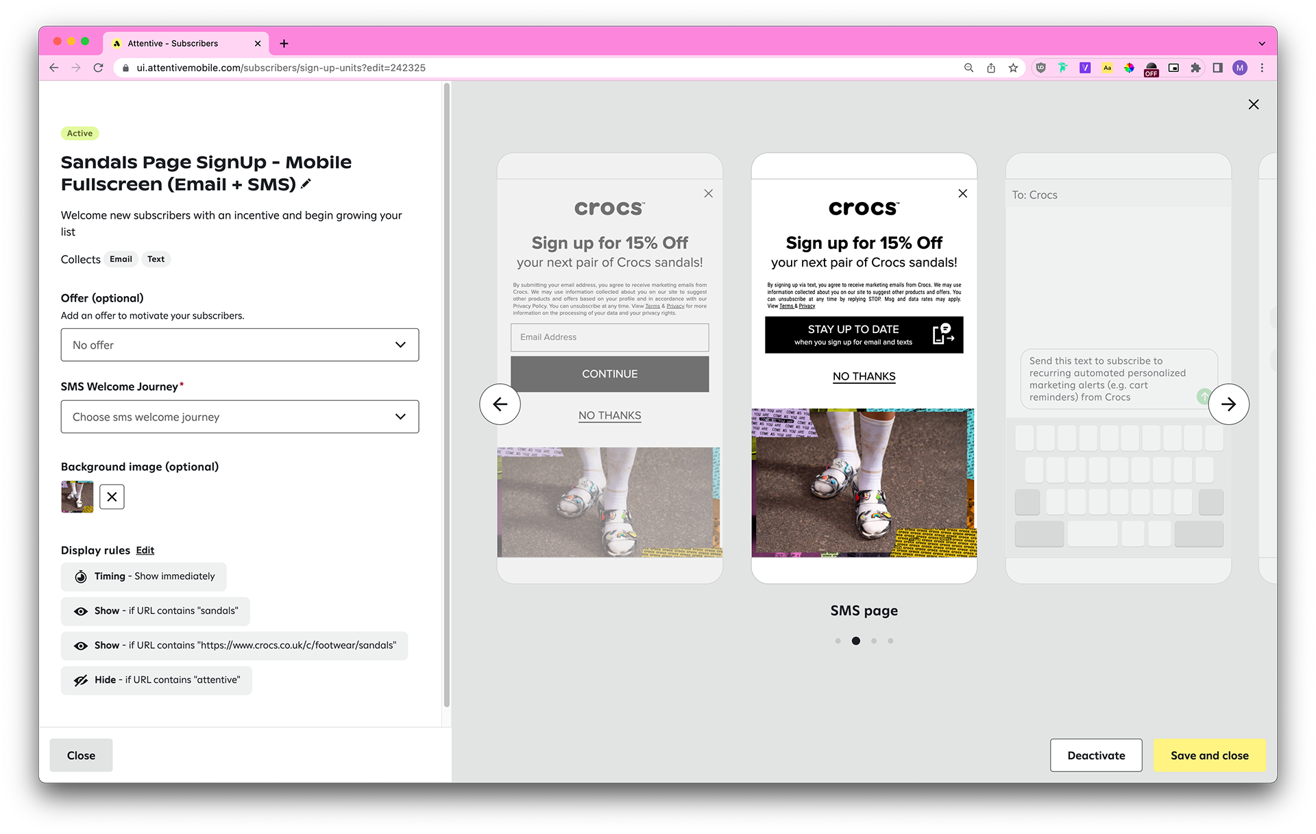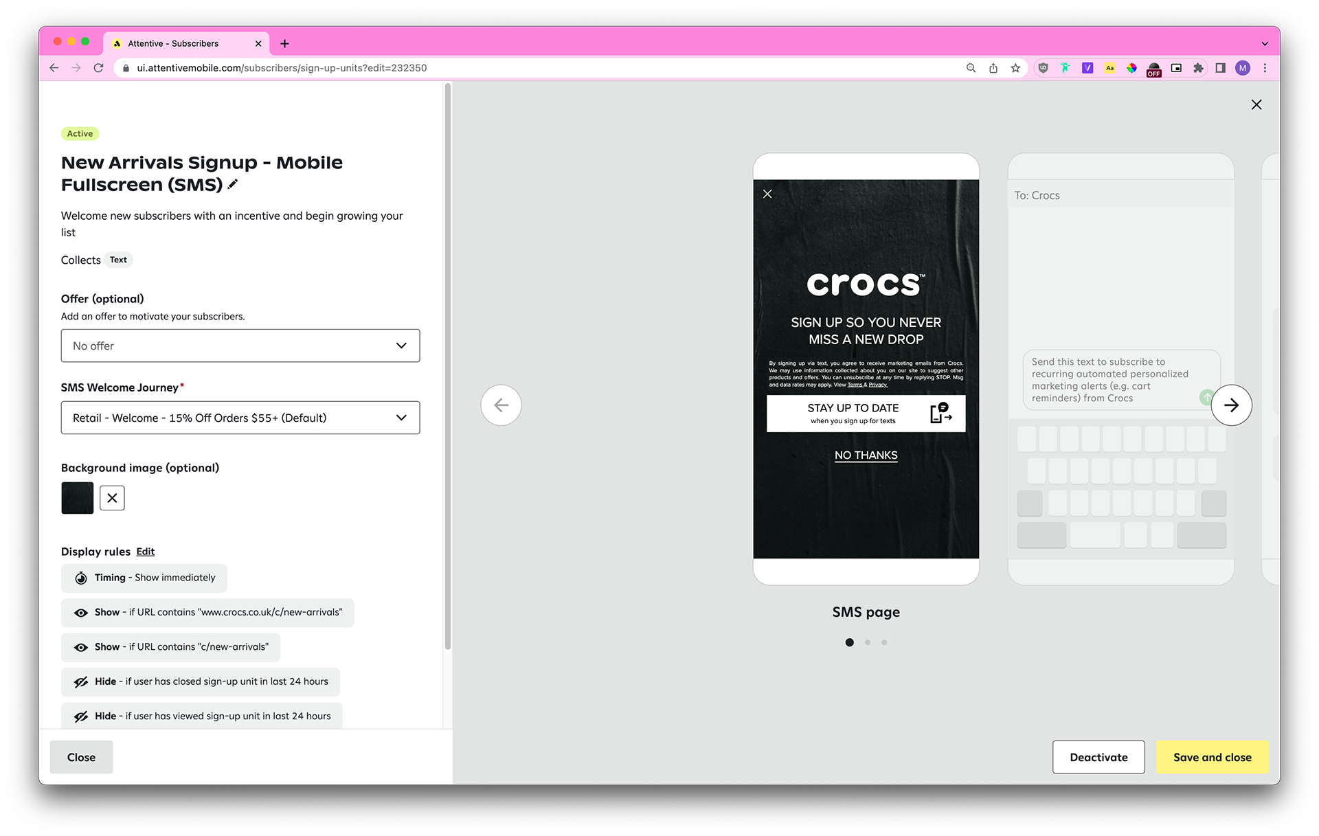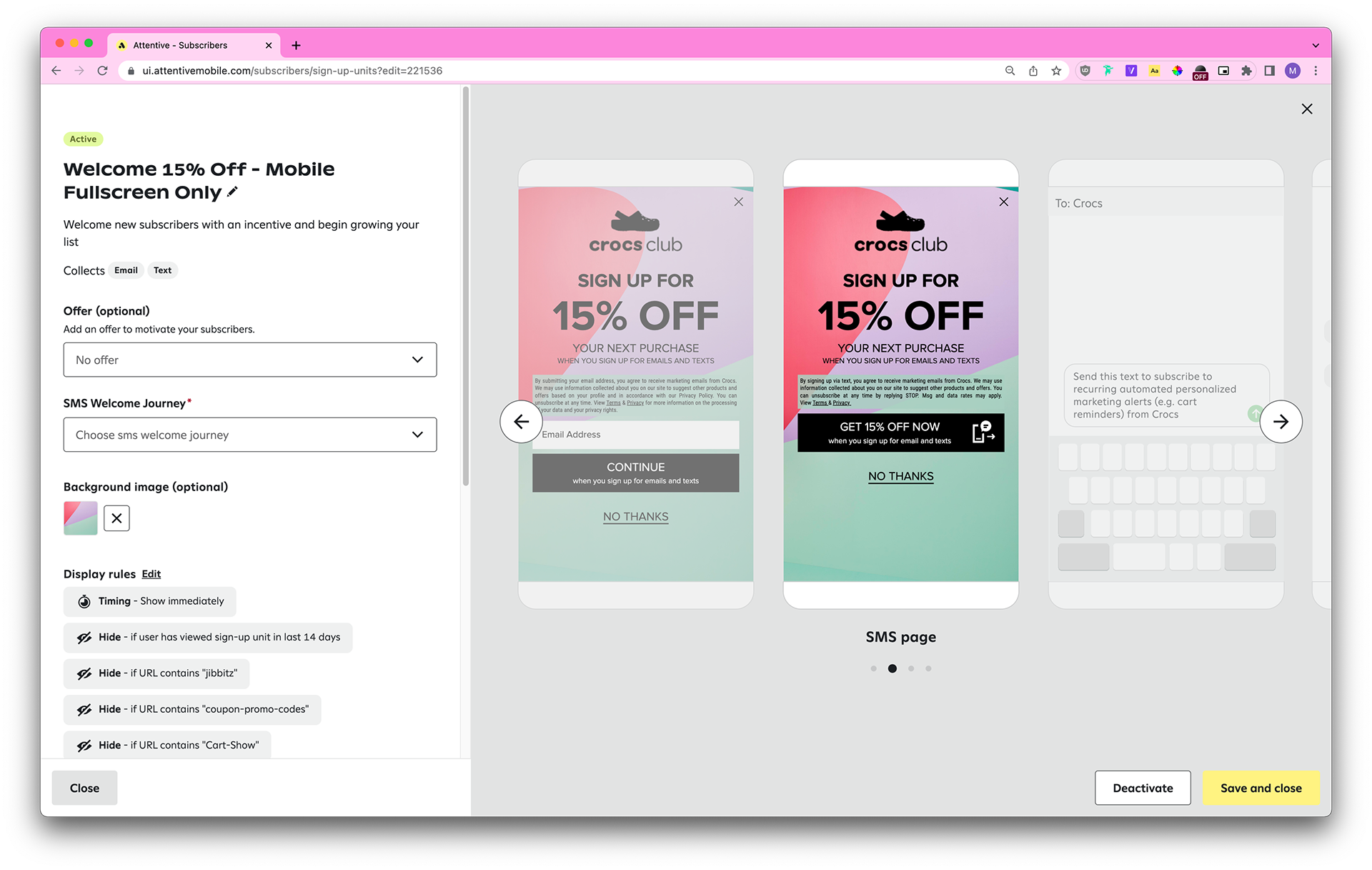 Each country has different laws pertaining to SMS marketing (ie: the legal text needs to contain certain disclaimers, the header copy needs to contain “when you sign up for texts,” the dismiss button styling needs to be the same as the CTA button styling, and so on), so we also take those into account.