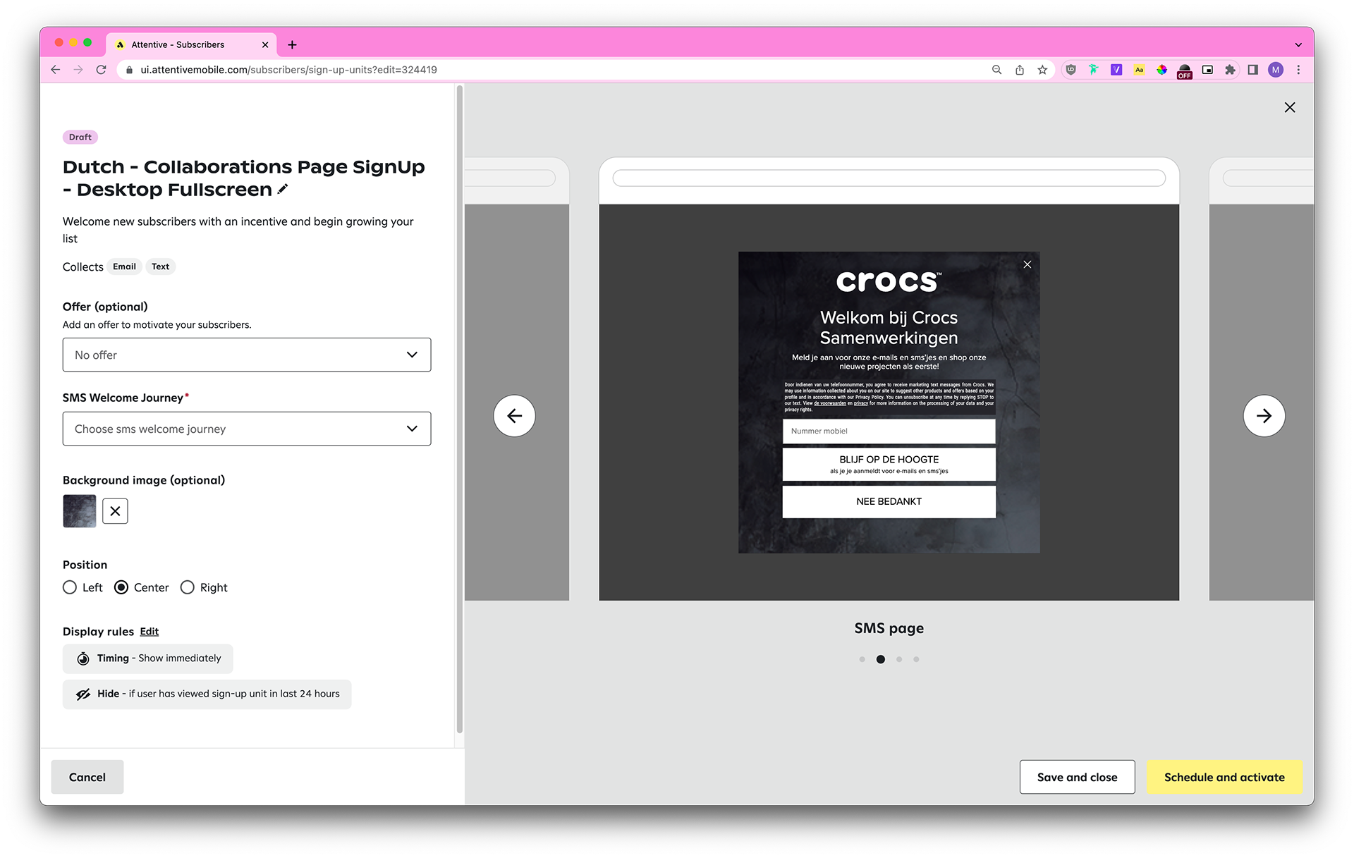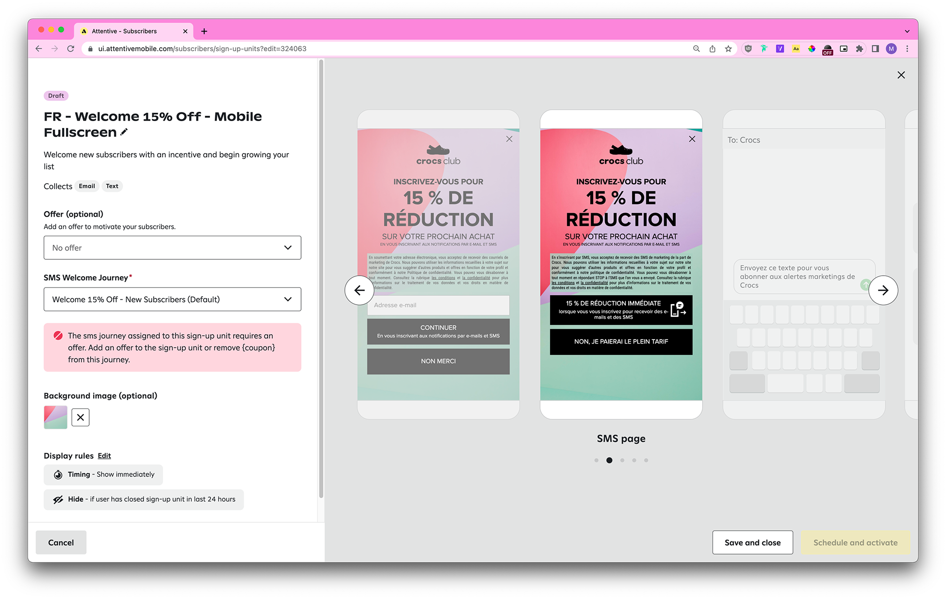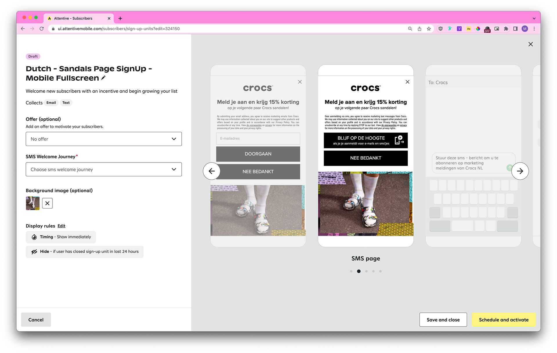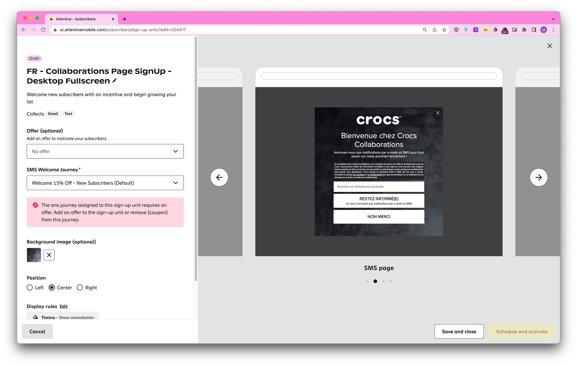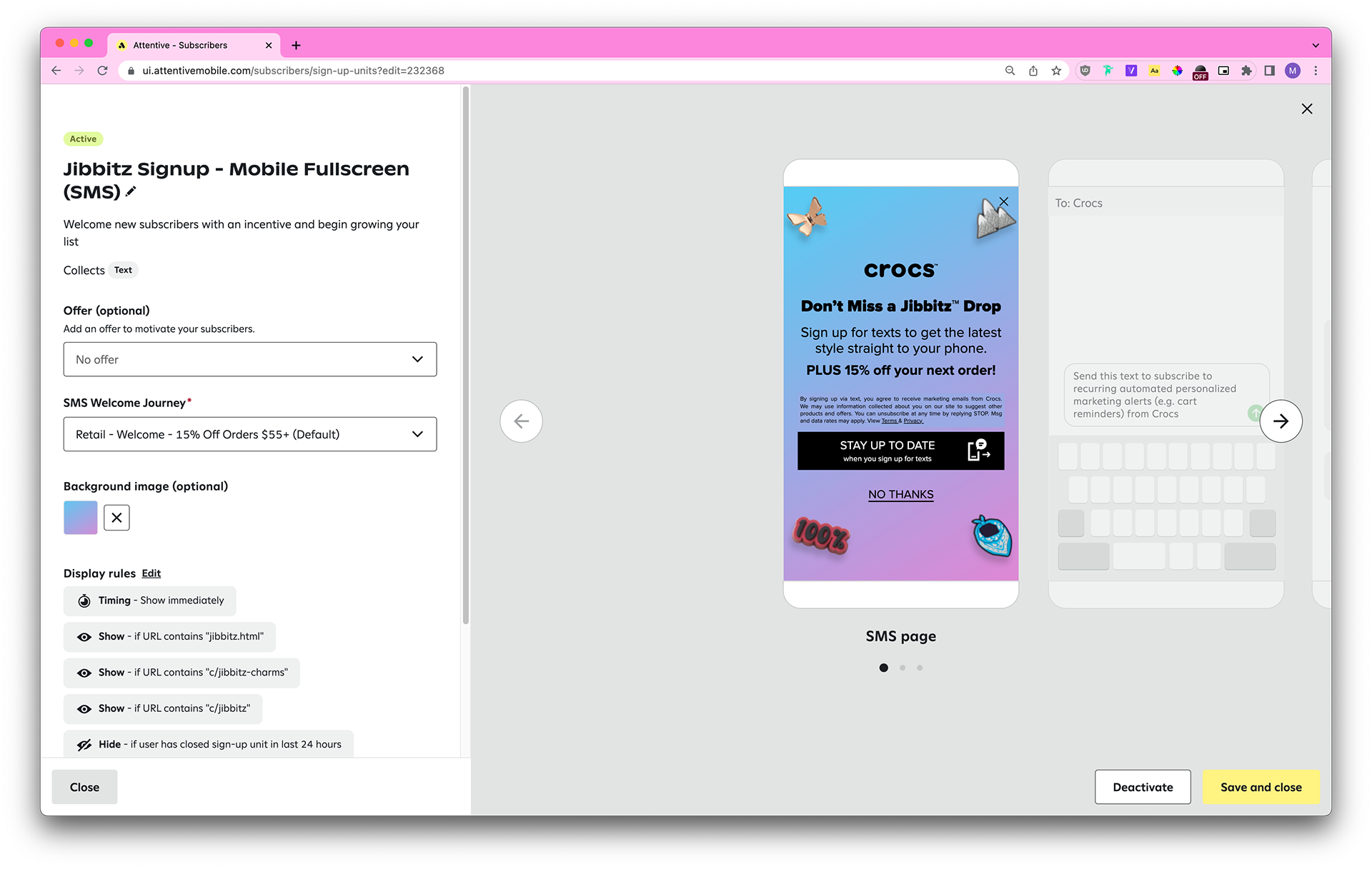 Each country has different laws pertaining to SMS marketing (ie: the legal text needs to contain certain disclaimers, the header copy needs to contain “when you sign up for texts,” the dismiss button styling needs to be the same as the CTA button styling, and so on), so we also take those into account.