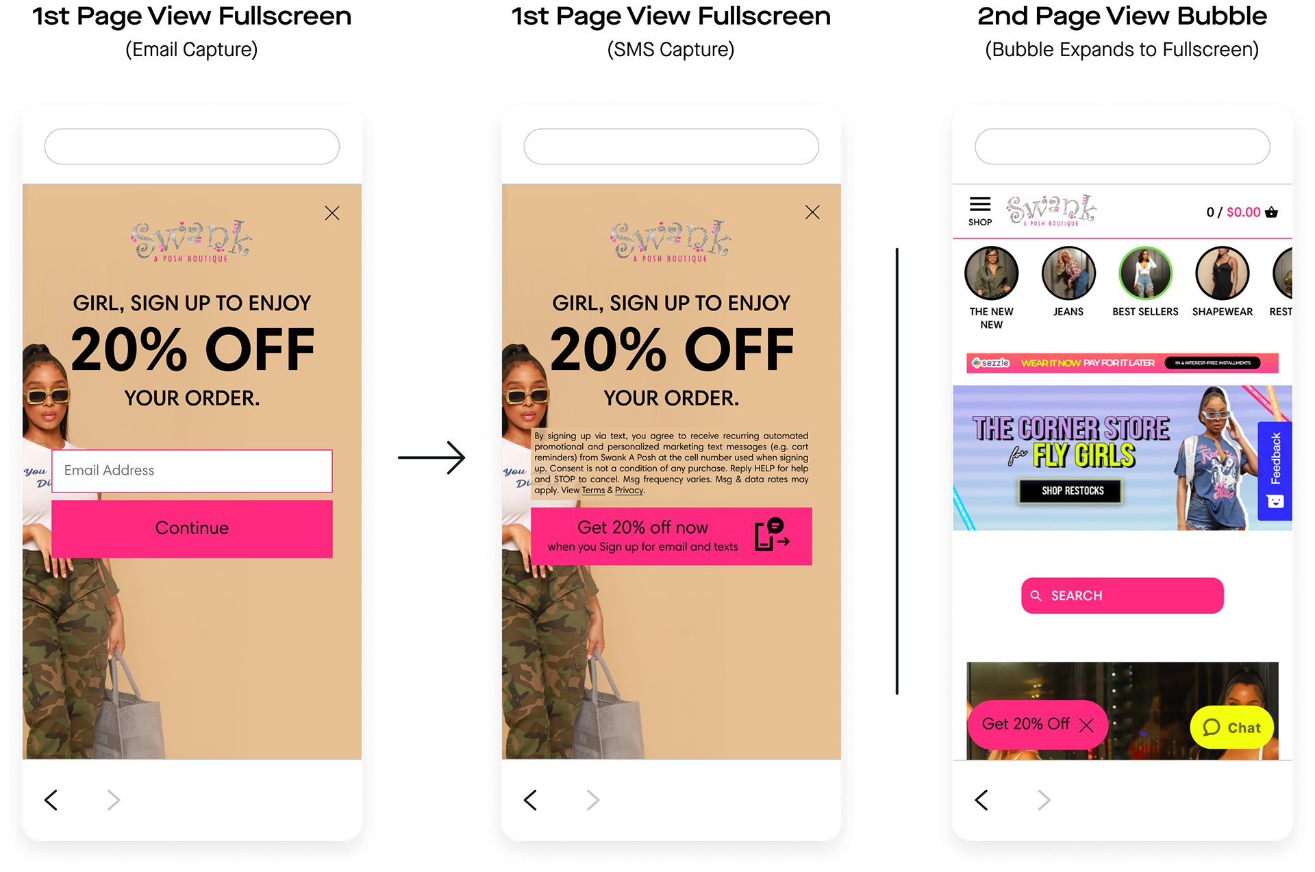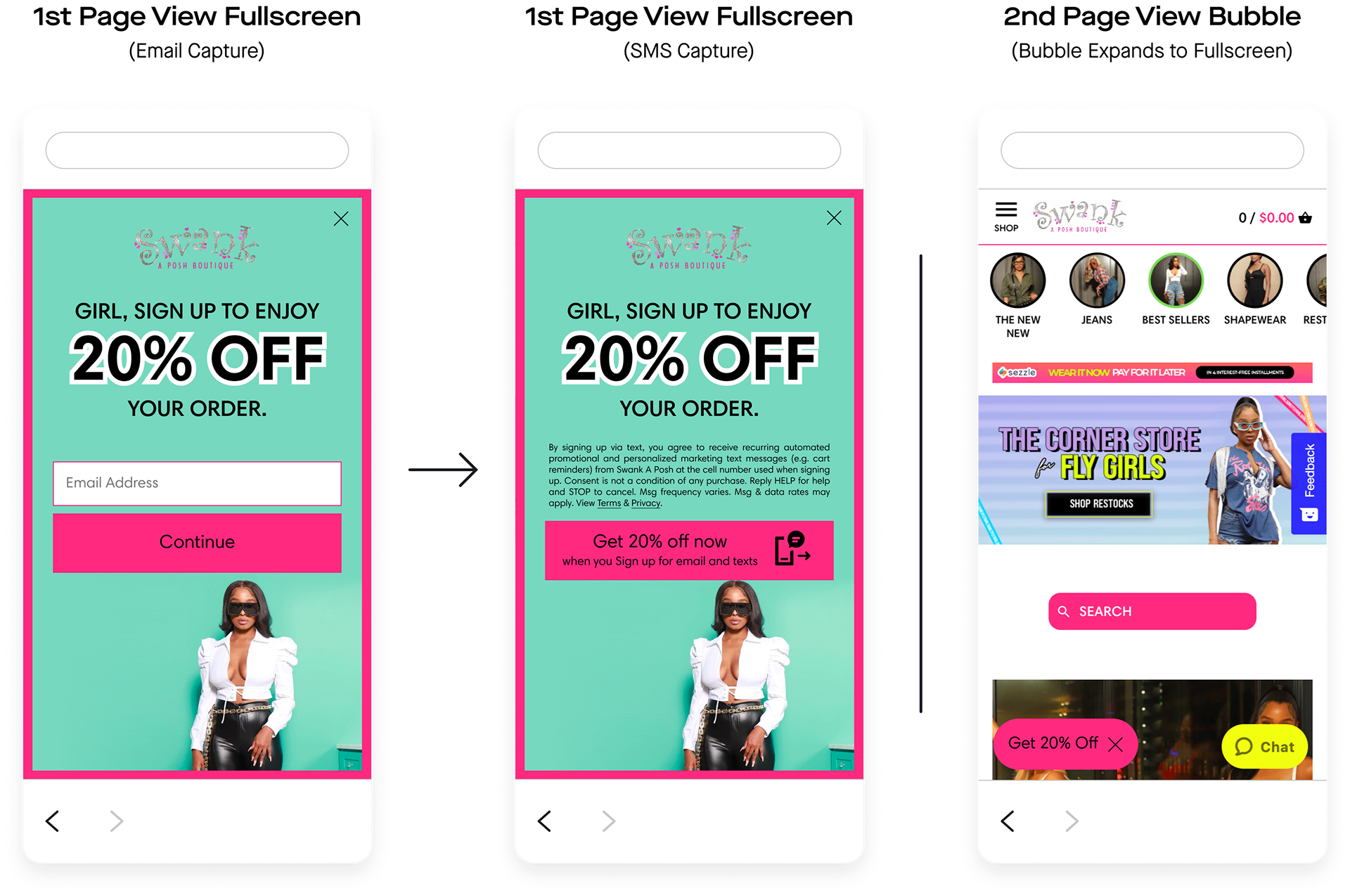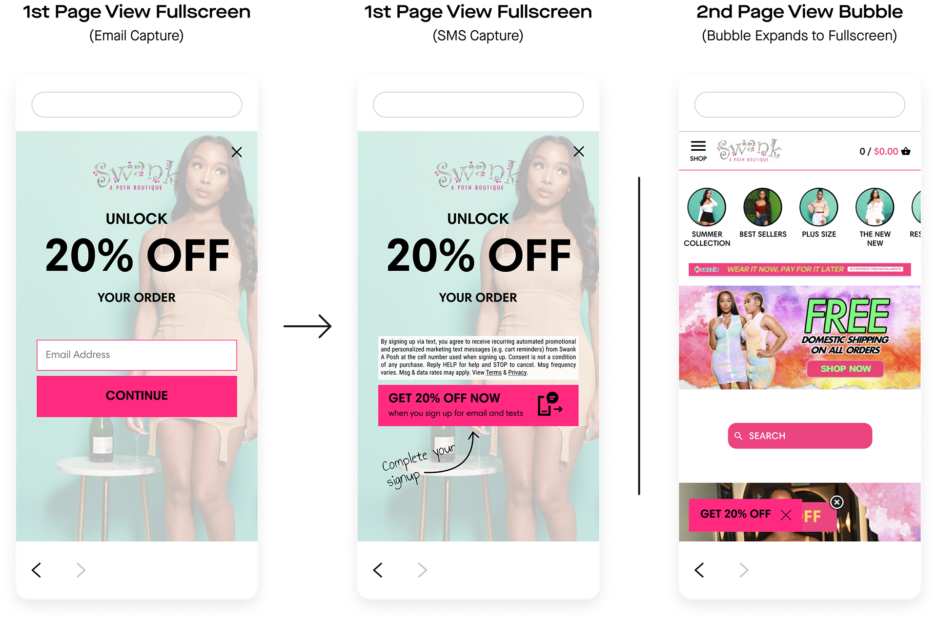 Swank A Posh launched the units I built. Overall, the client gained 17,470 new SMS subscribers and 42,137 new email subscribers directly through these units. Comparatively, the previous units netted the client 10,399 new SMS subscribers and 22,561 new email subscribers, and the client was “very unhappy with” how they looked.