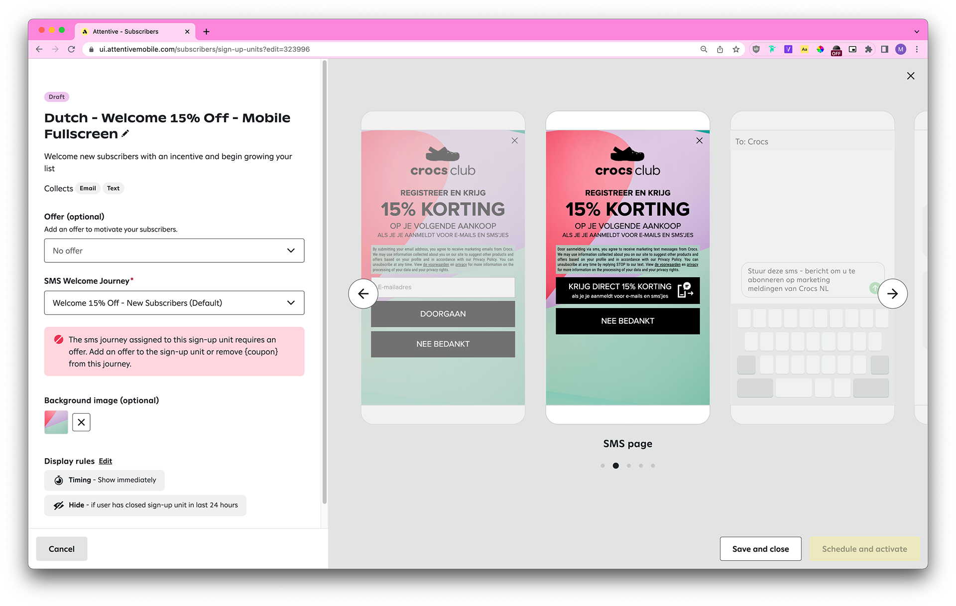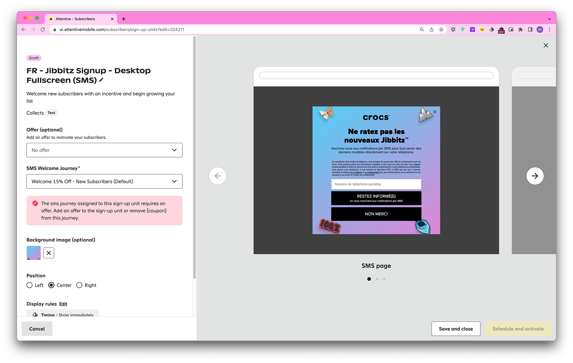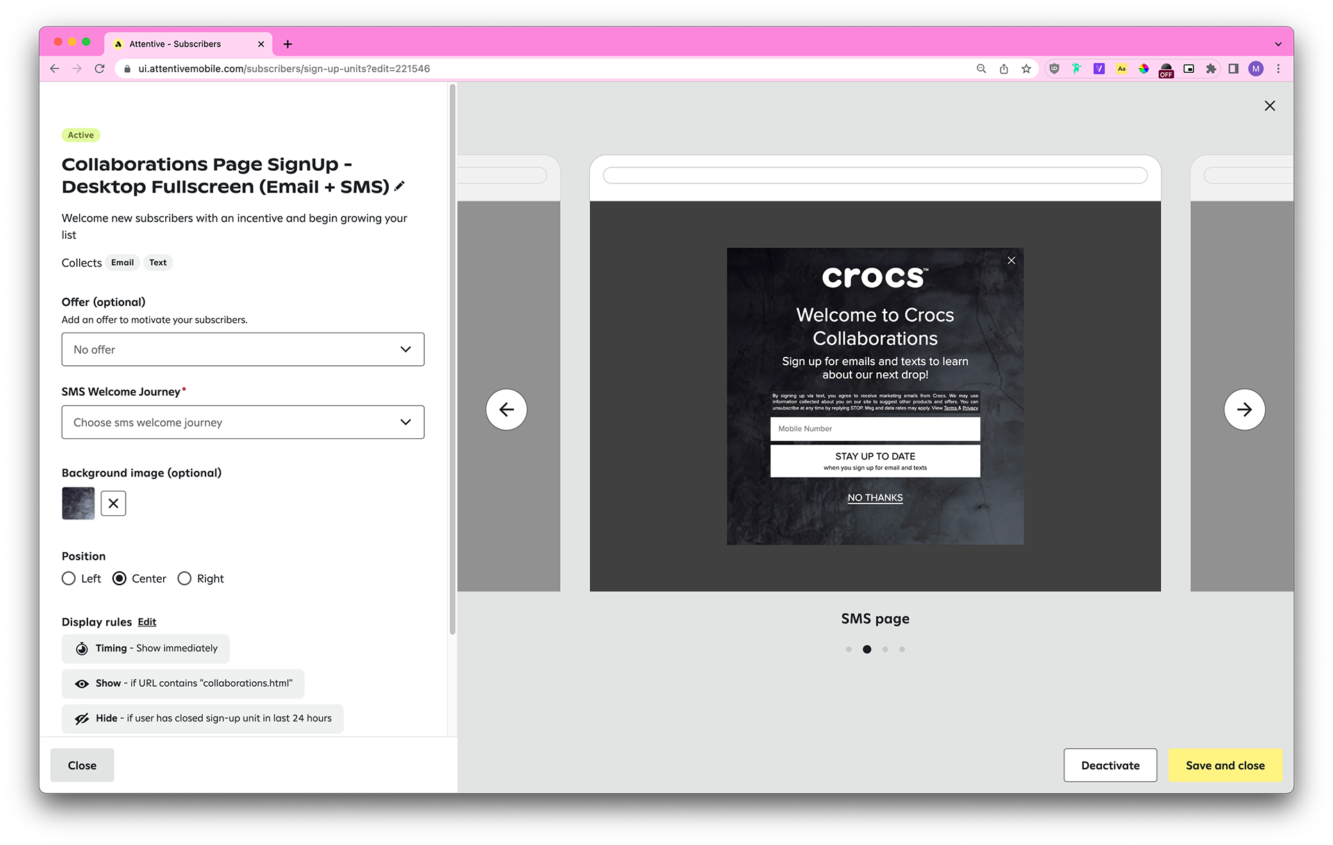 Each country has different laws pertaining to SMS marketing (ie: the legal text needs to contain certain disclaimers, the header copy needs to contain “when you sign up for texts,” the dismiss button styling needs to be the same as the CTA button styling, and so on), so we also take those into account.