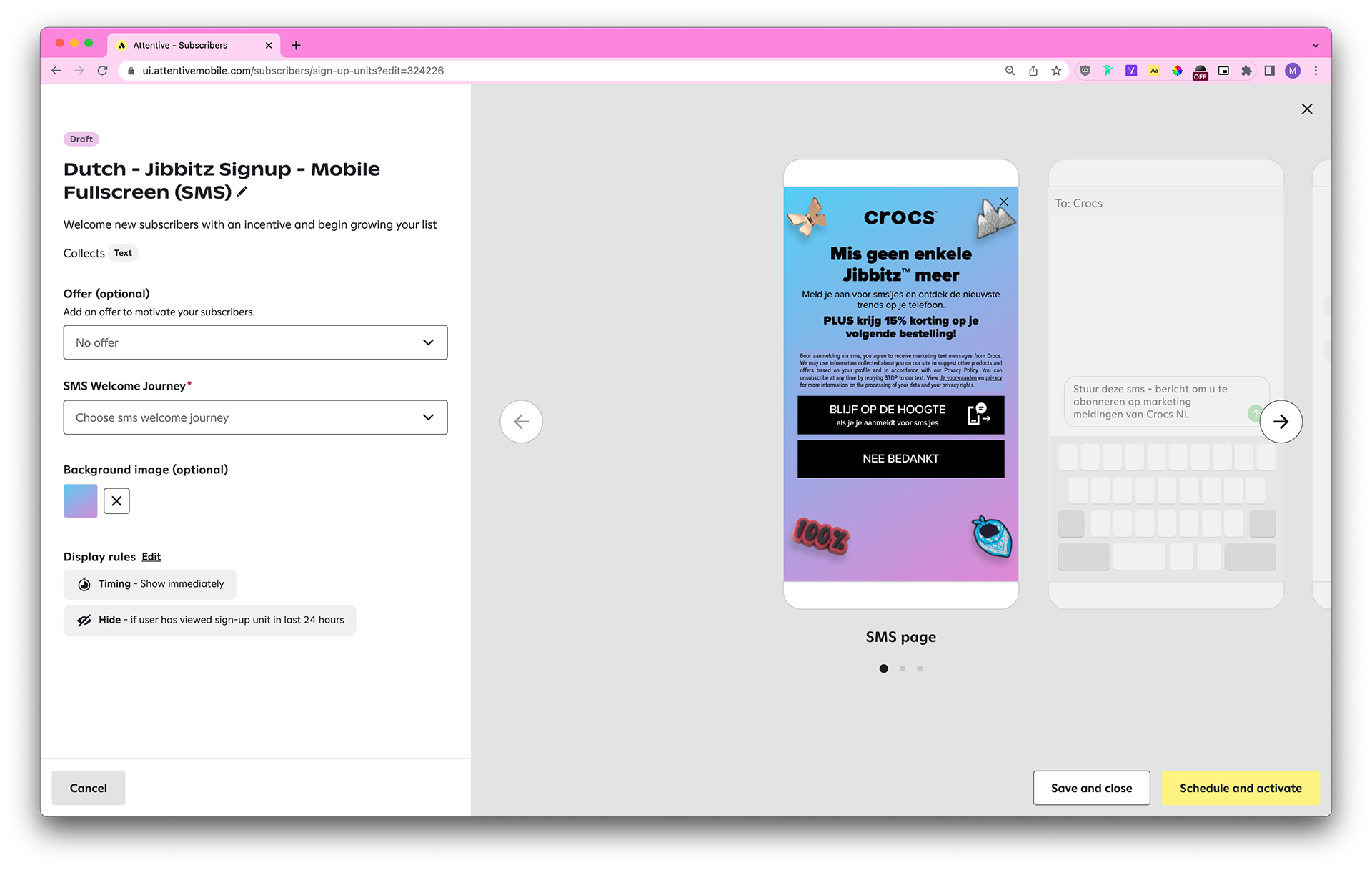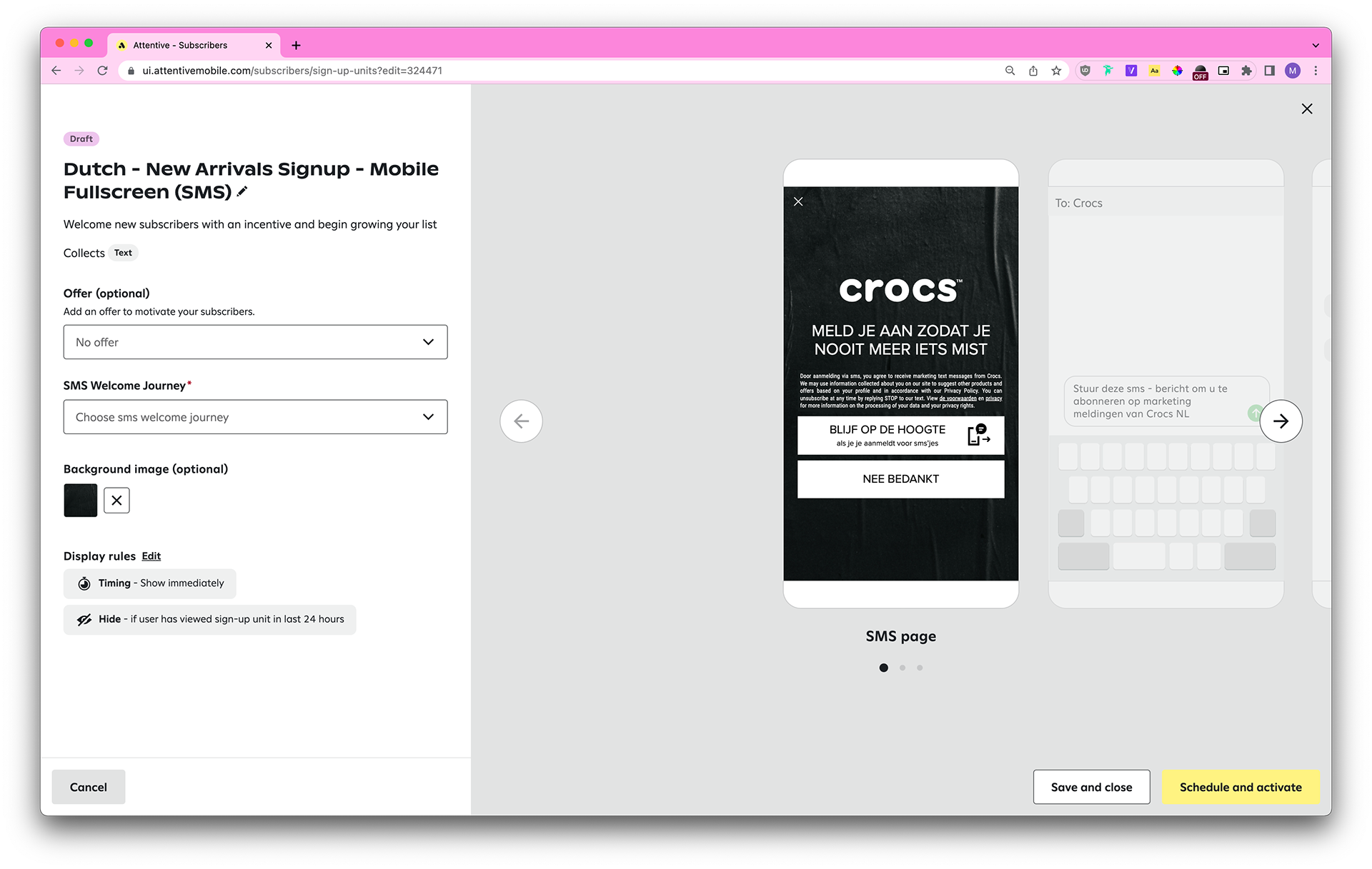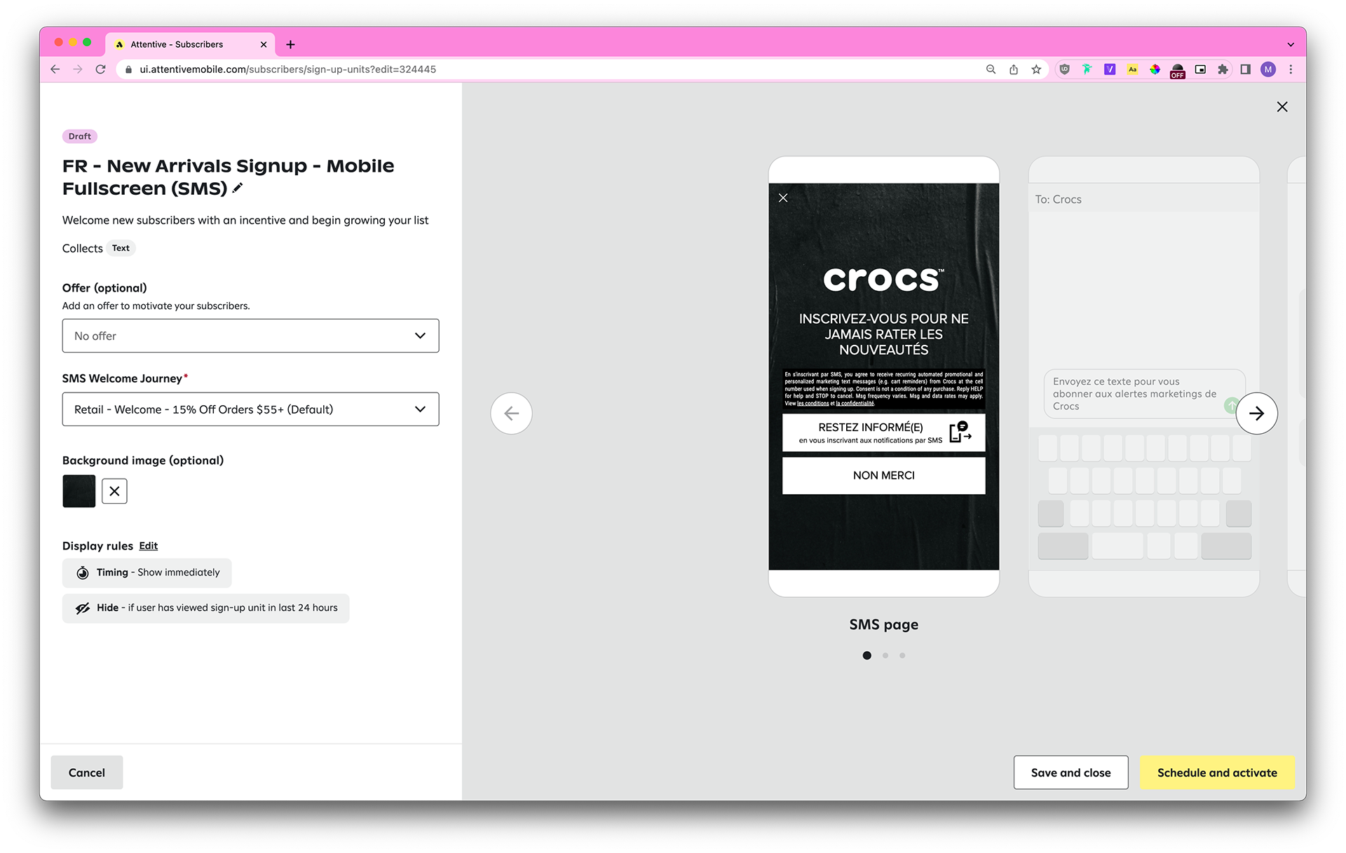 Each country has different laws pertaining to SMS marketing (ie: the legal text needs to contain certain disclaimers, the header copy needs to contain “when you sign up for texts,” the dismiss button styling needs to be the same as the CTA button styling, and so on), so we also take those into account.