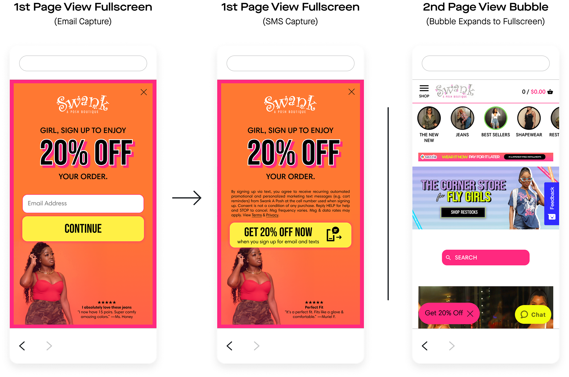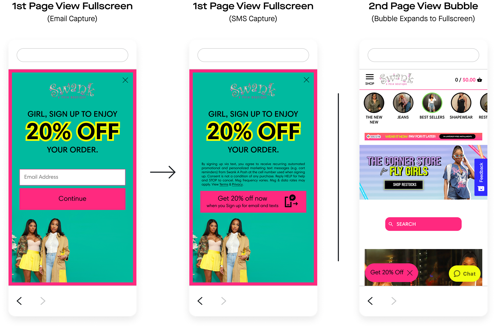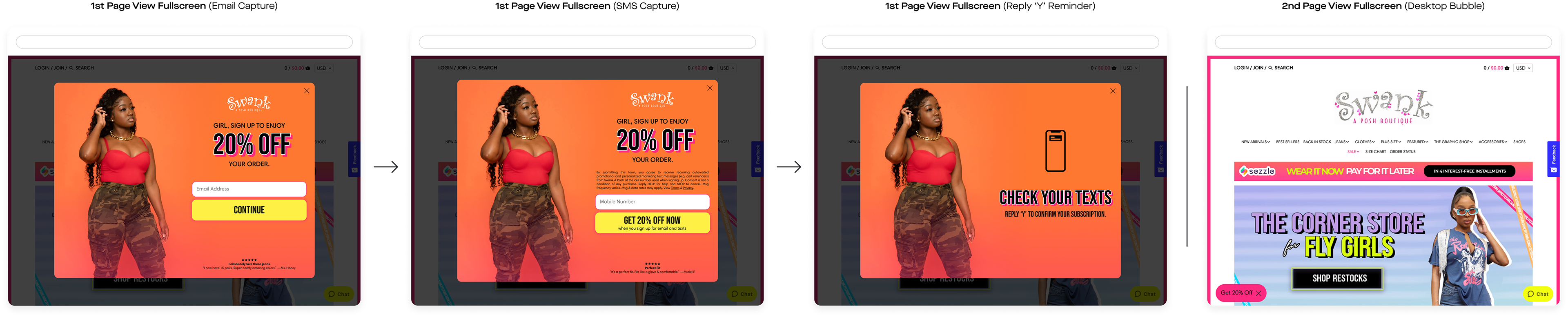 Swank A Posh launched the units I built. Overall, the client gained 17,470 new SMS subscribers and 42,137 new email subscribers directly through these units. Comparatively, the previous units netted the client 10,399 new SMS subscribers and 22,561 new email subscribers, and the client was “very unhappy with” how they looked.