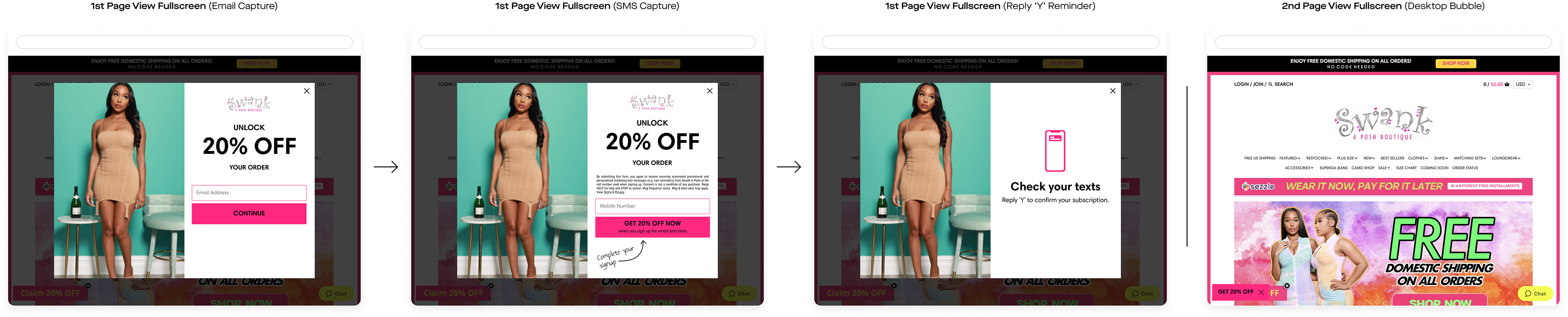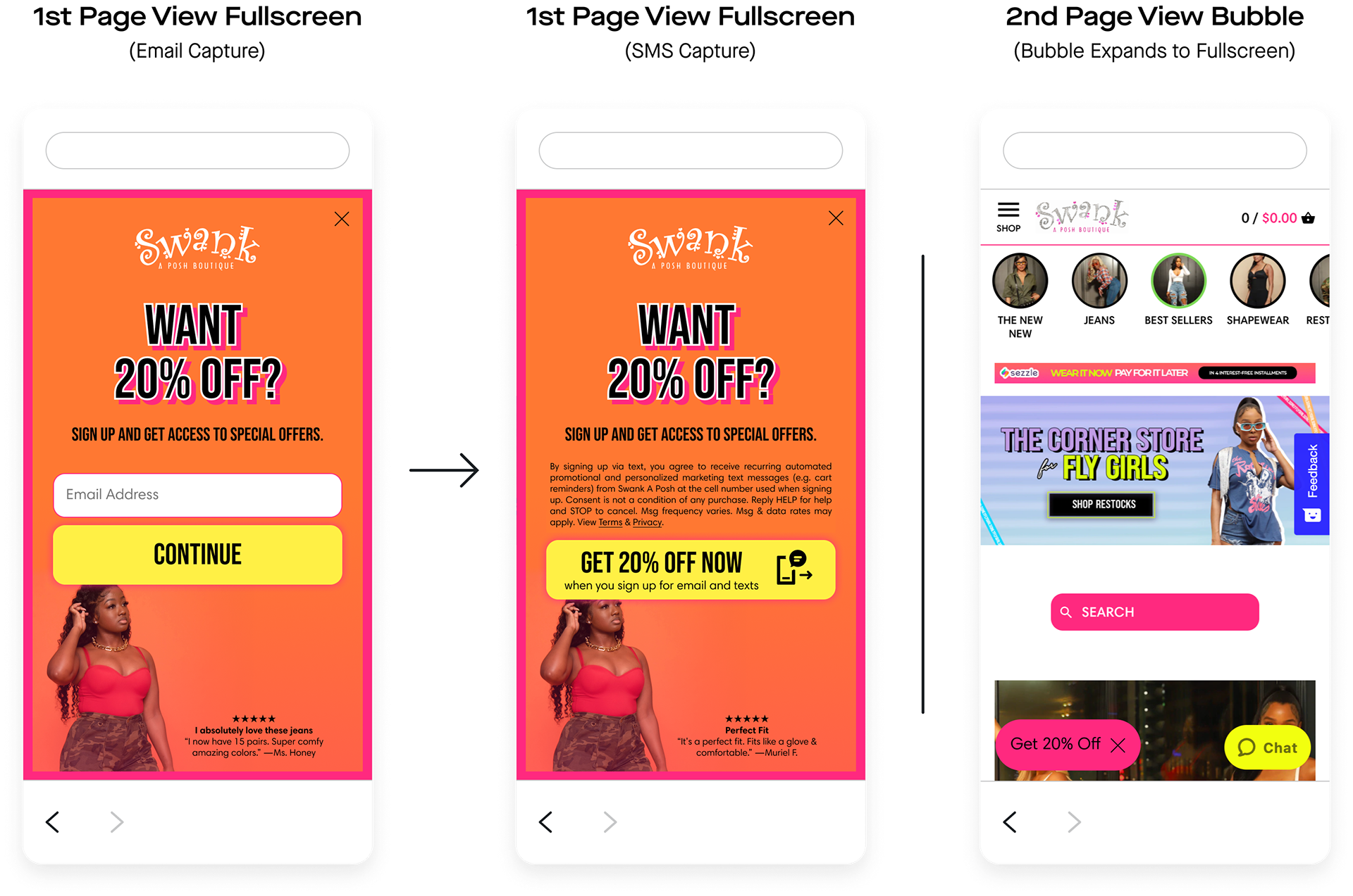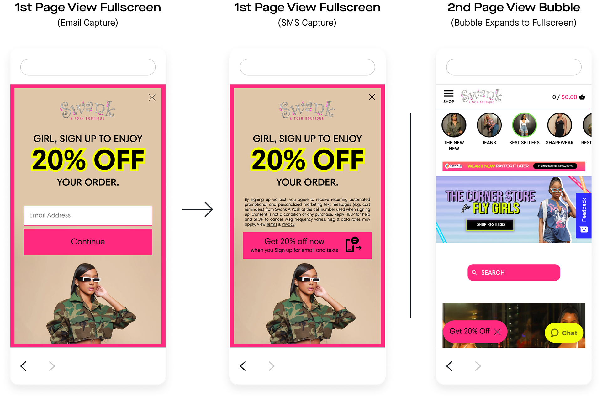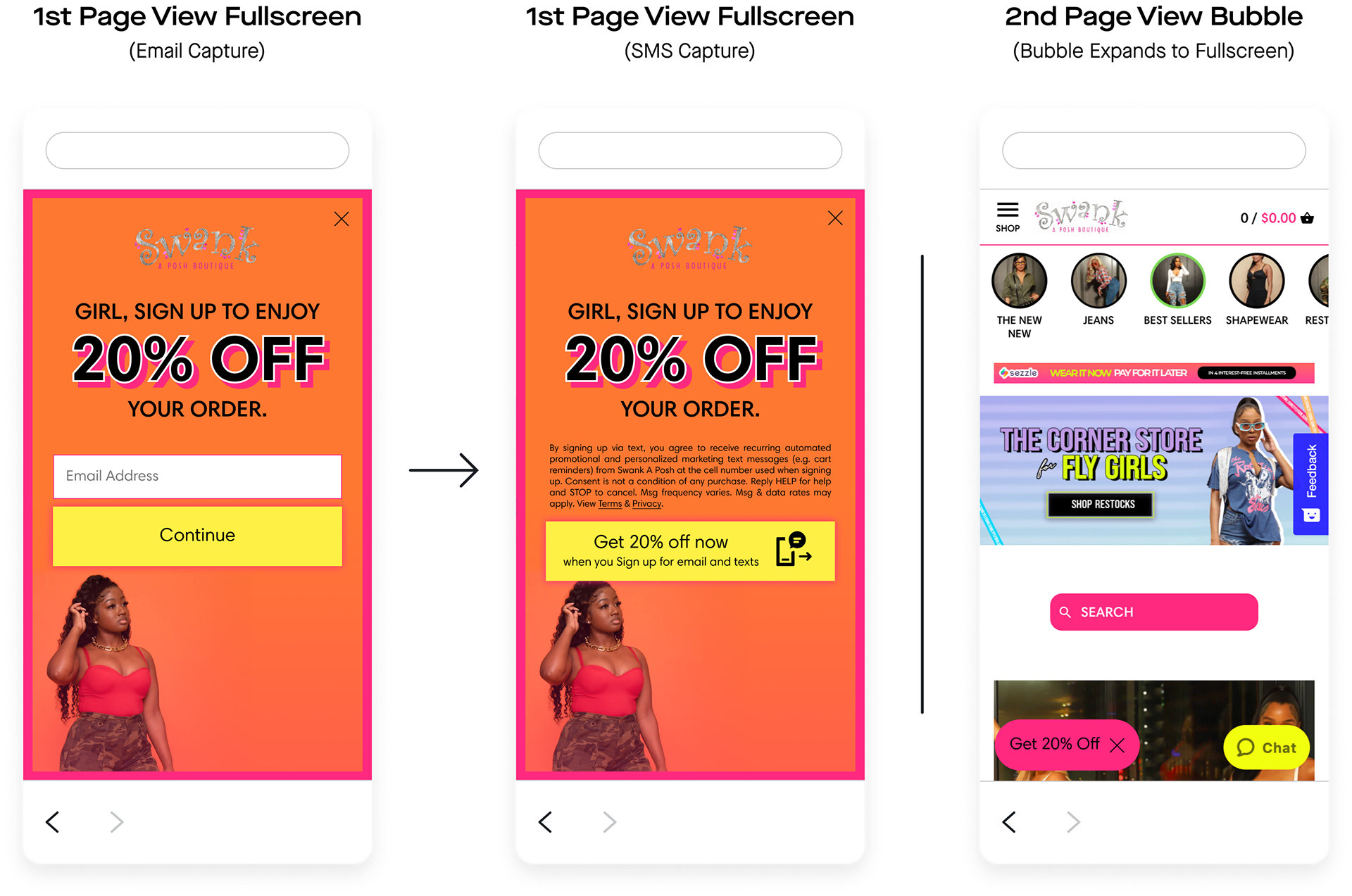 Swank A Posh launched the units I built. Overall, the client gained 17,470 new SMS subscribers and 42,137 new email subscribers directly through these units. Comparatively, the previous units netted the client 10,399 new SMS subscribers and 22,561 new email subscribers, and the client was “very unhappy with” how they looked.