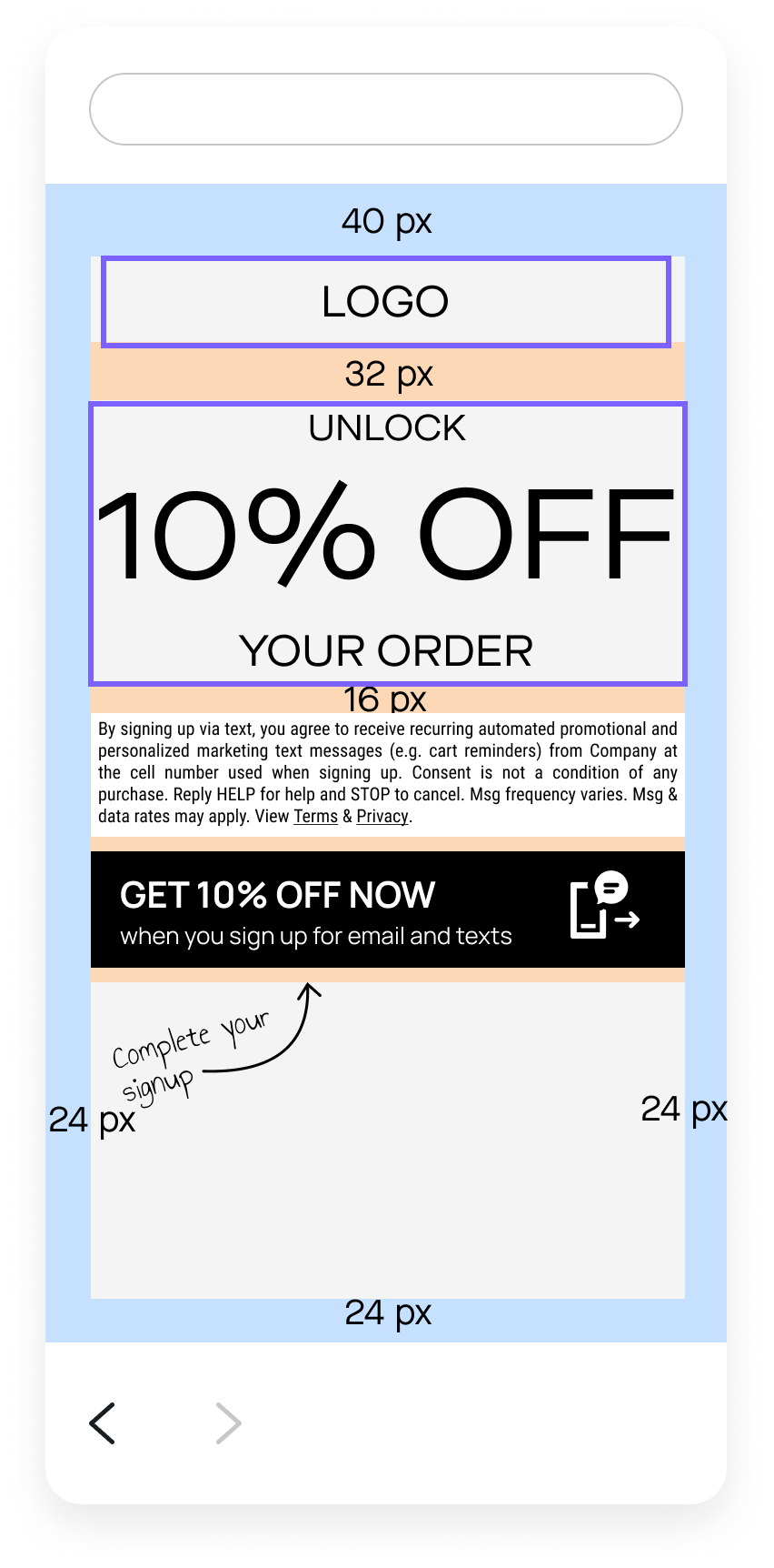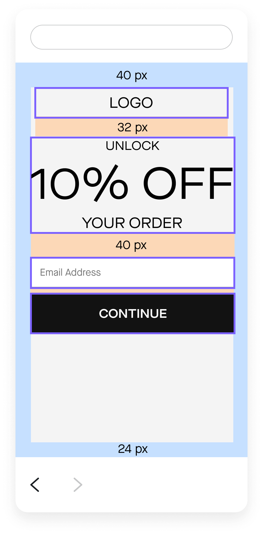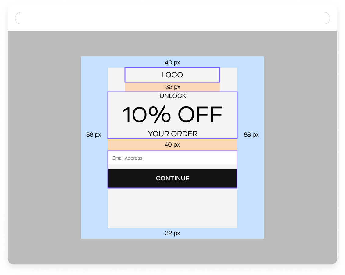 To manage client expectations, we applied auto layout to all mockups specifying the exact vertical spacing between elements. The V8 template mockups didn’t include auto layout, so if someone changed the default “UNLOCK 10% OFF YOUR ORDER” header to something else, they might then need to manually adjust the vertical spacing between elements on the mockups.