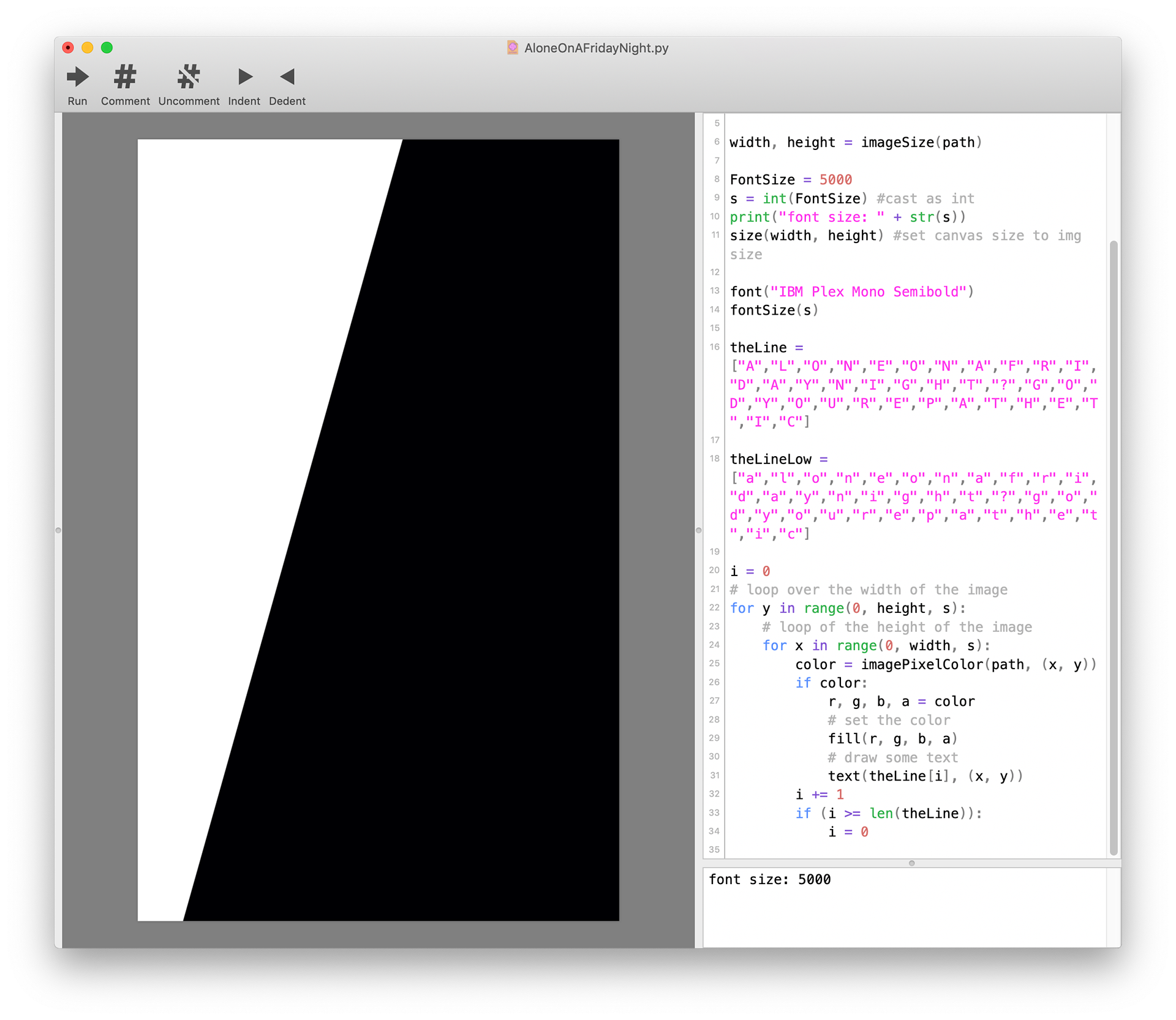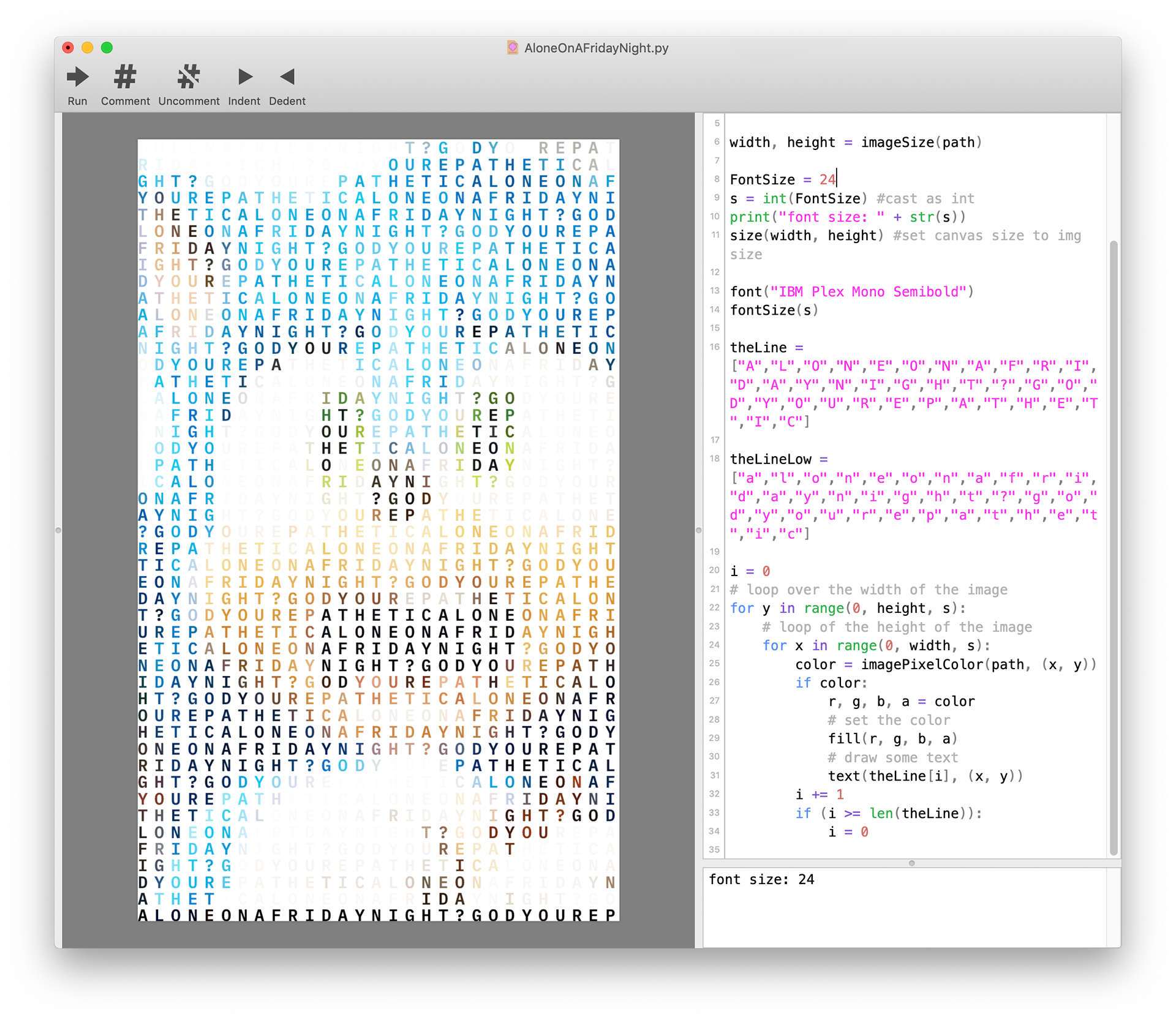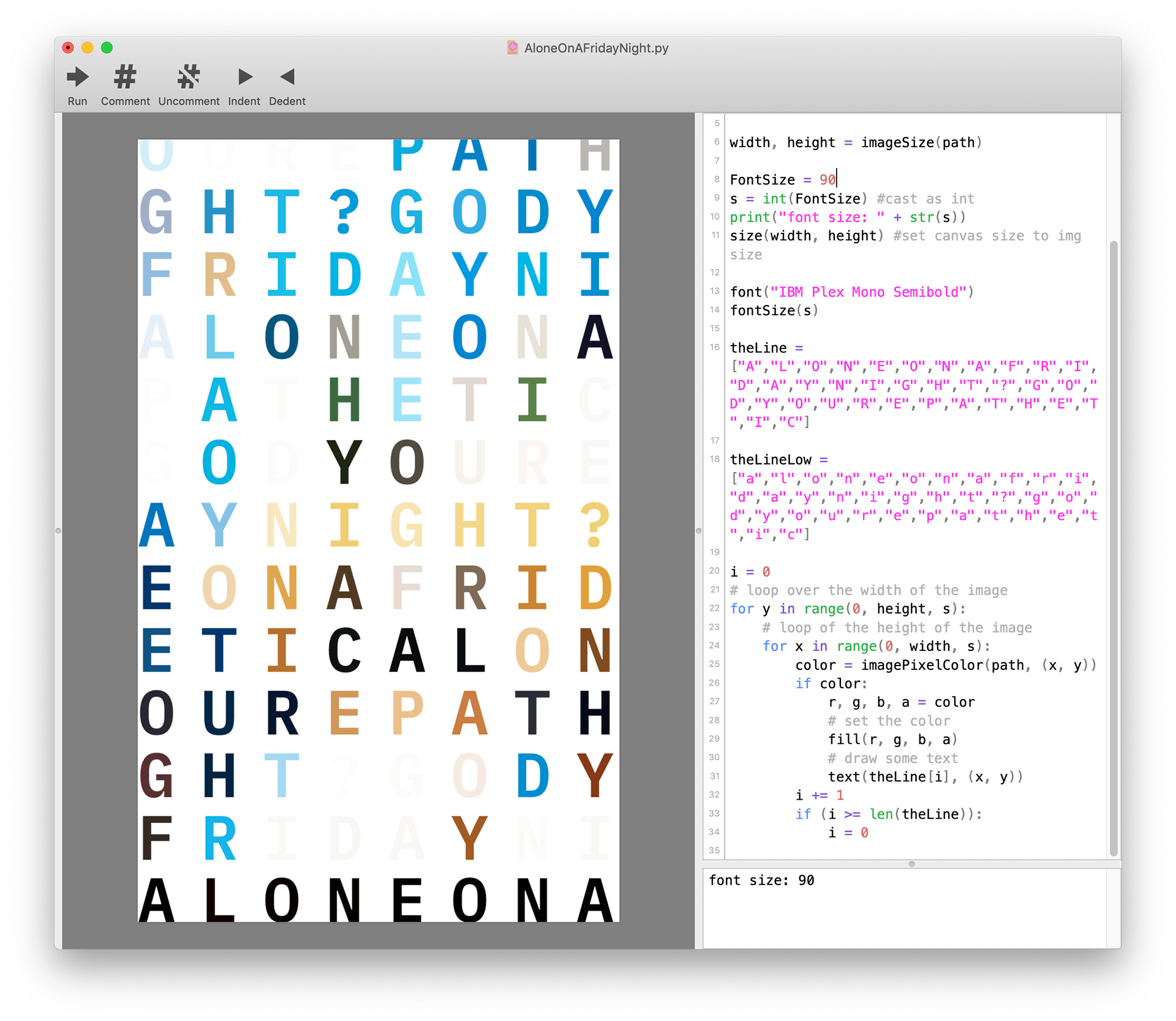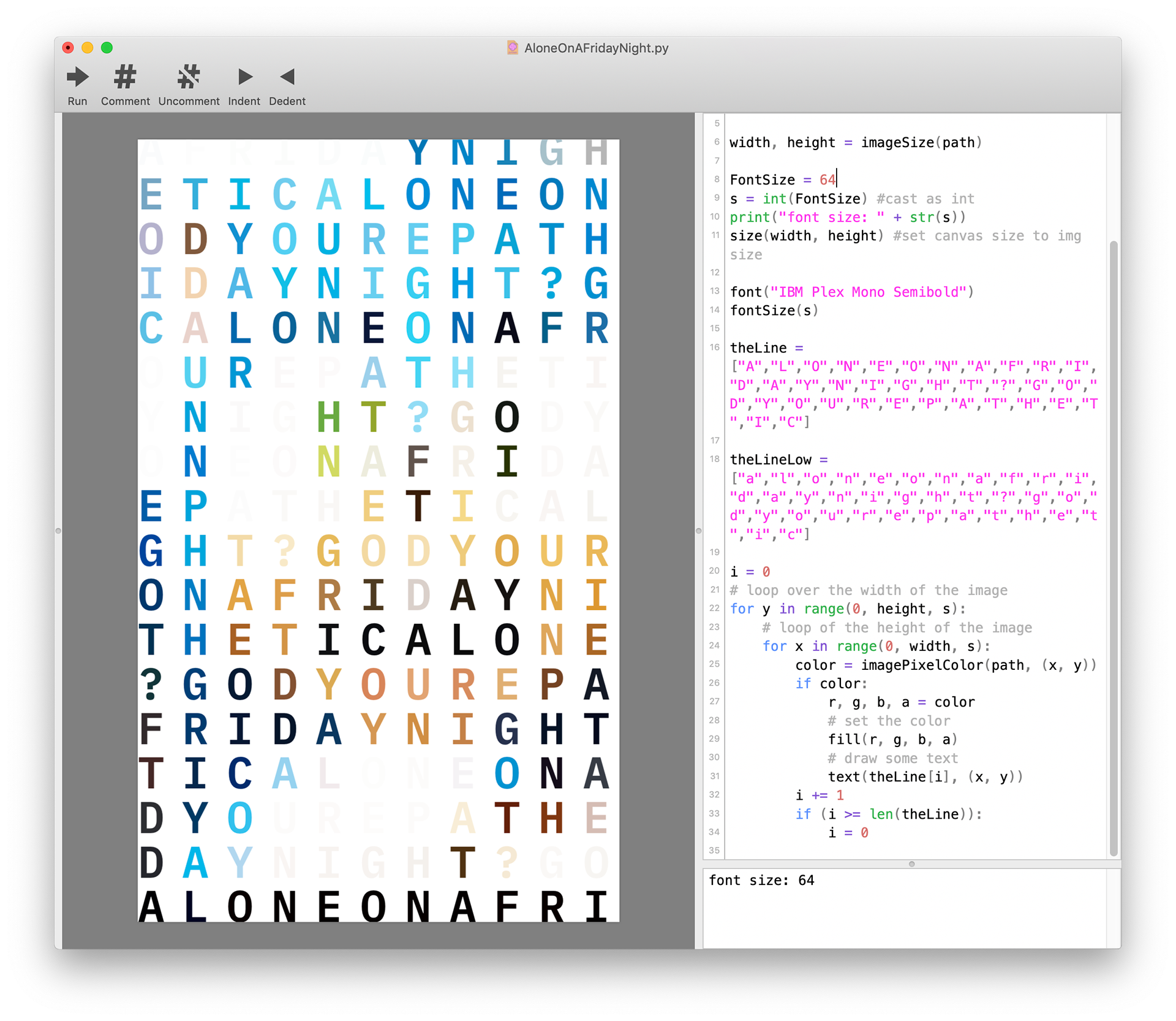 I made this poster in collaboration with Grace Park, Jefferson Duan, and Joseph Wang. The code iterates through a list of the letters “Alone on a Friday night? God, you’re pathetic” (we are funny. Or cringey). Each letter takes its color from the corresponding pixel at that location, using DrawBot’s imagePixelColor() method. We were fortunate to print this on WashU’s new risograph printers! February 2020