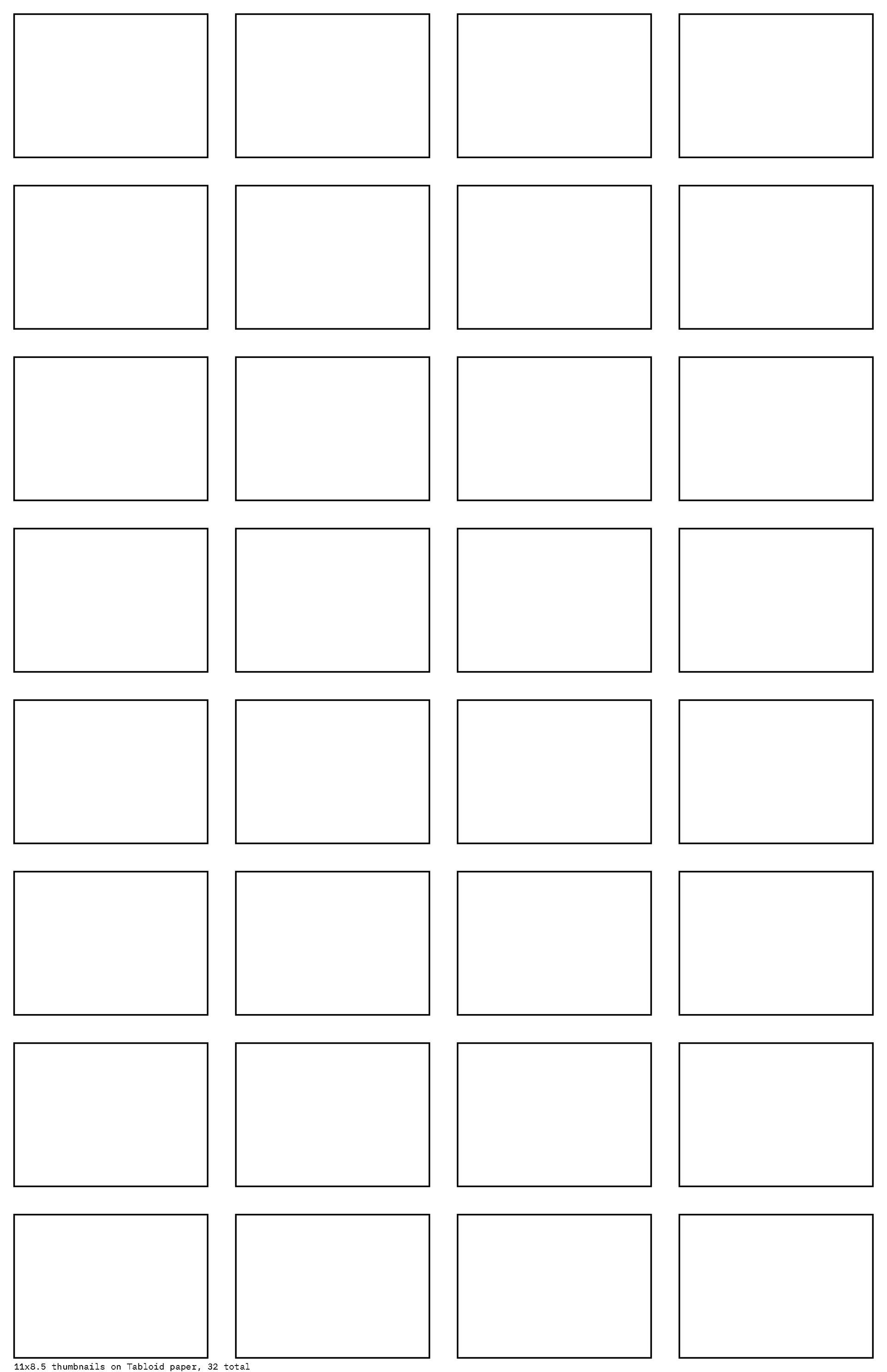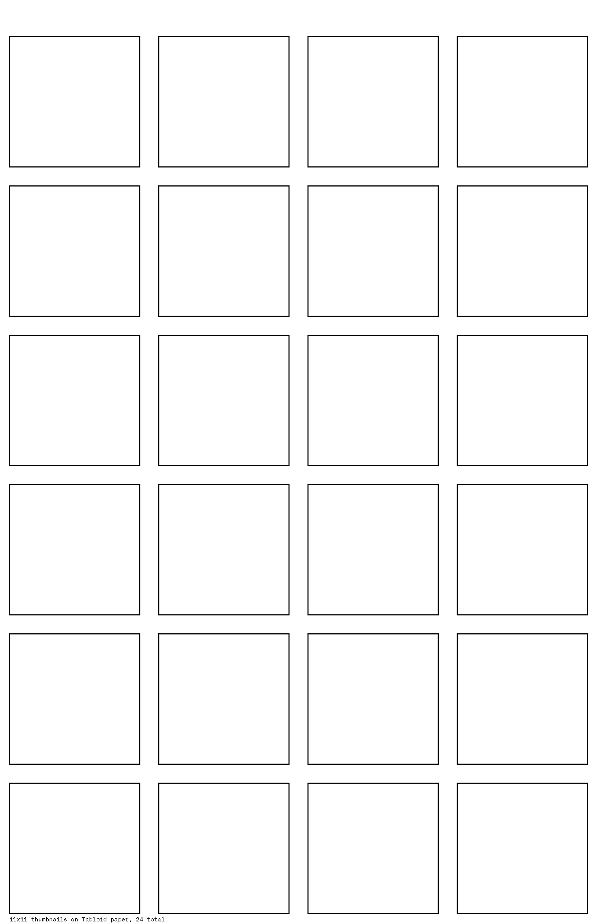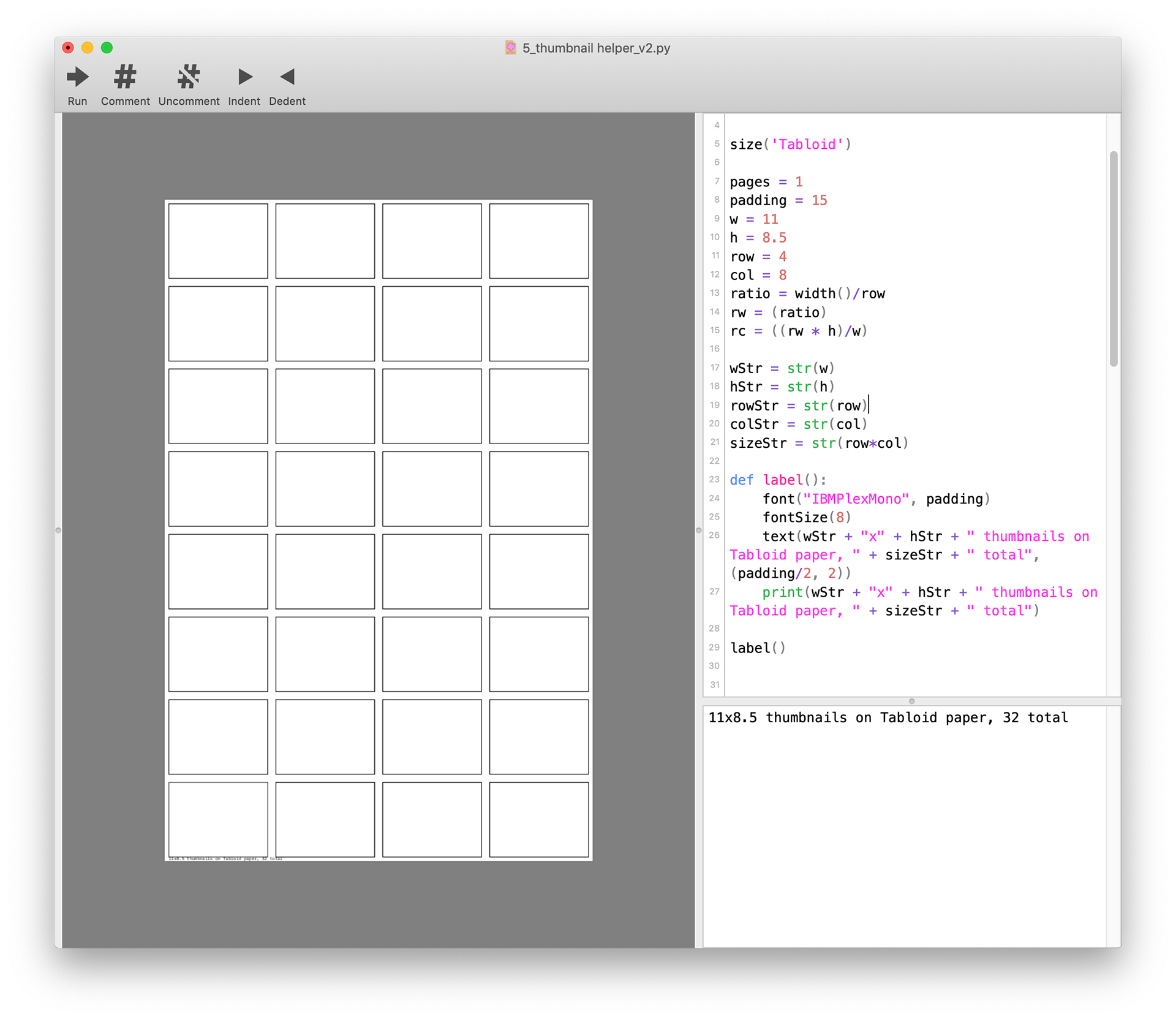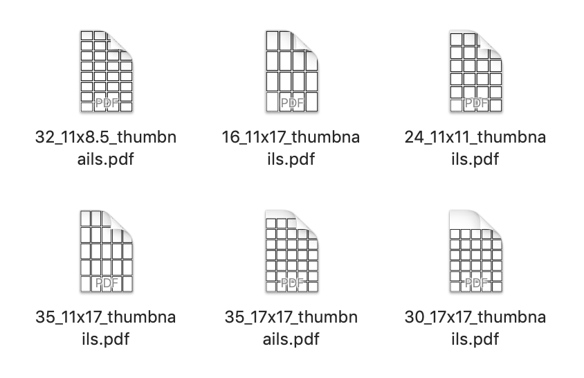 The code takes inputs for paper size, thumbnail size, and number of rows and columns. It iterates through the specified number of rows and columns, then draws the frames. In the future I’d like this tool to utilize DrawBot’s user interface and be available to people who need a quick way to generate thumbnail frames. February 2020