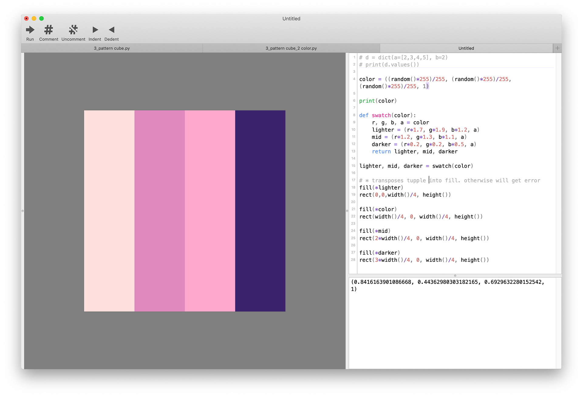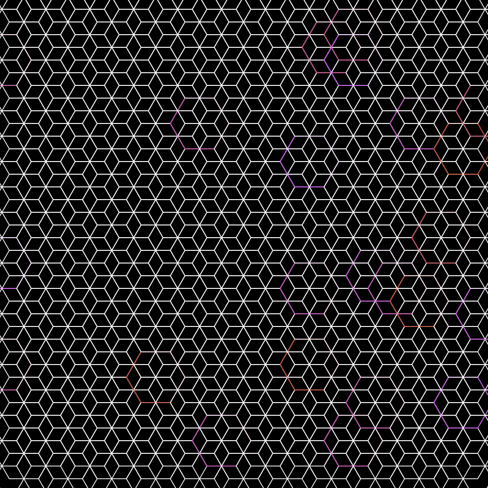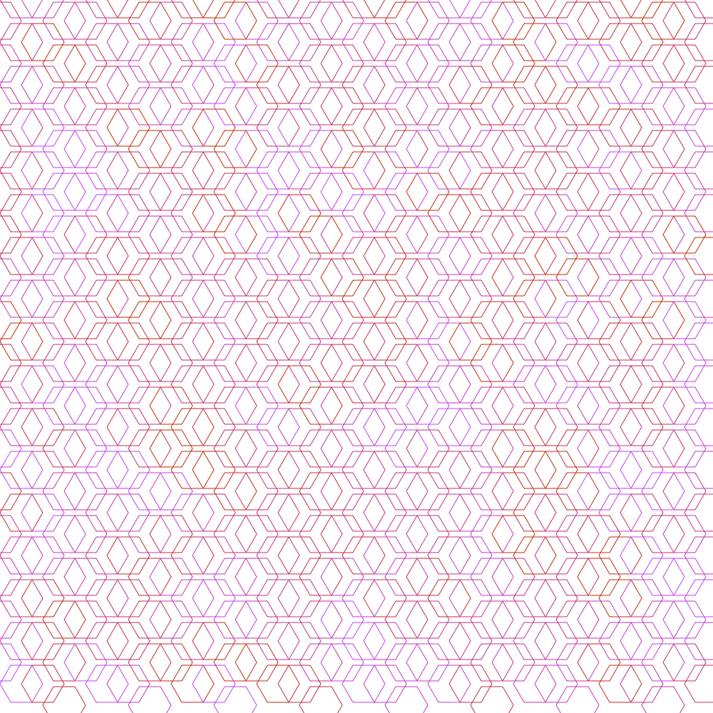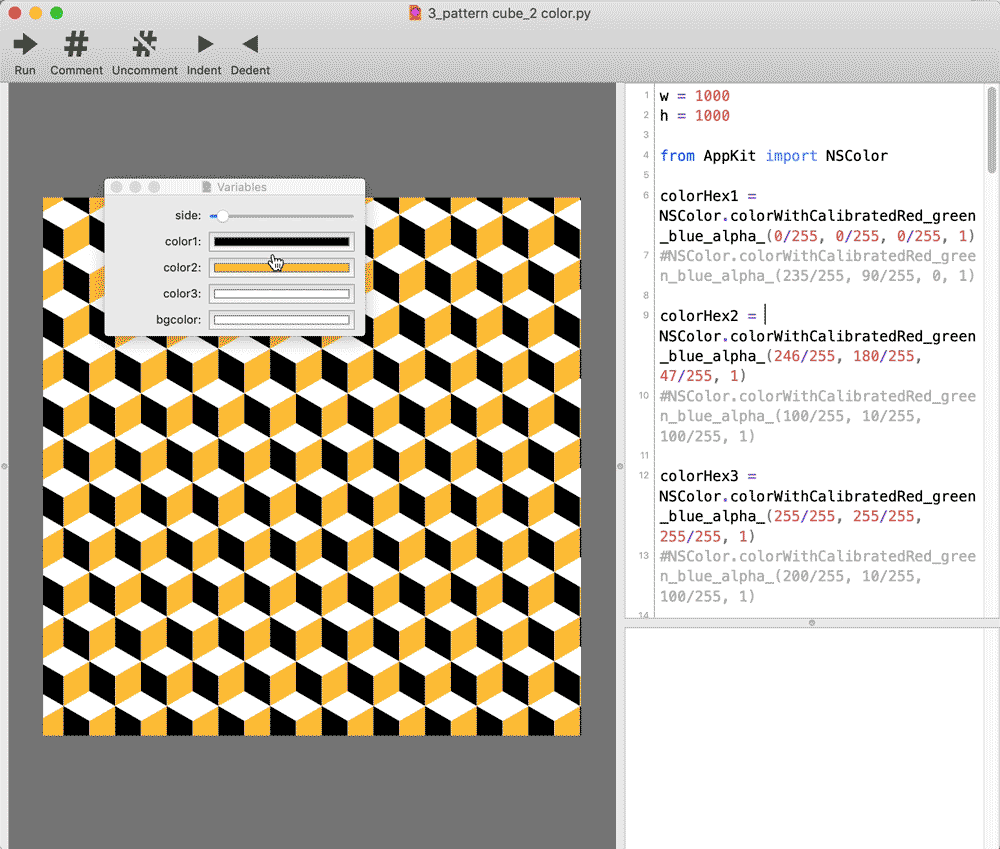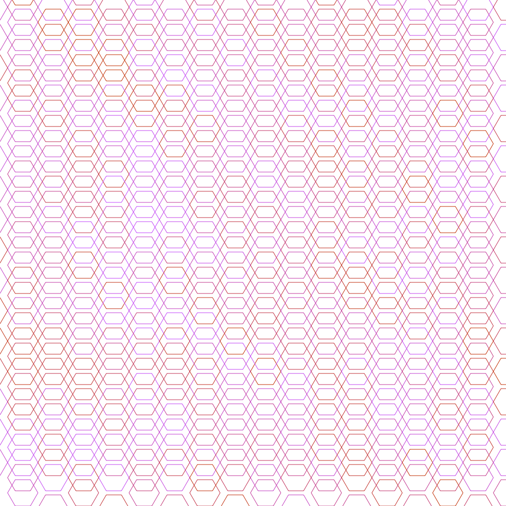 I used DrawBot to create patterns via iterating through the canvas’ width and height. In line with my obsession with honeycomb configurations, many of these patterns create hexagons in one way or another. One version allows the user to pick the colors of the different shapes that make up the pattern. January 2020
