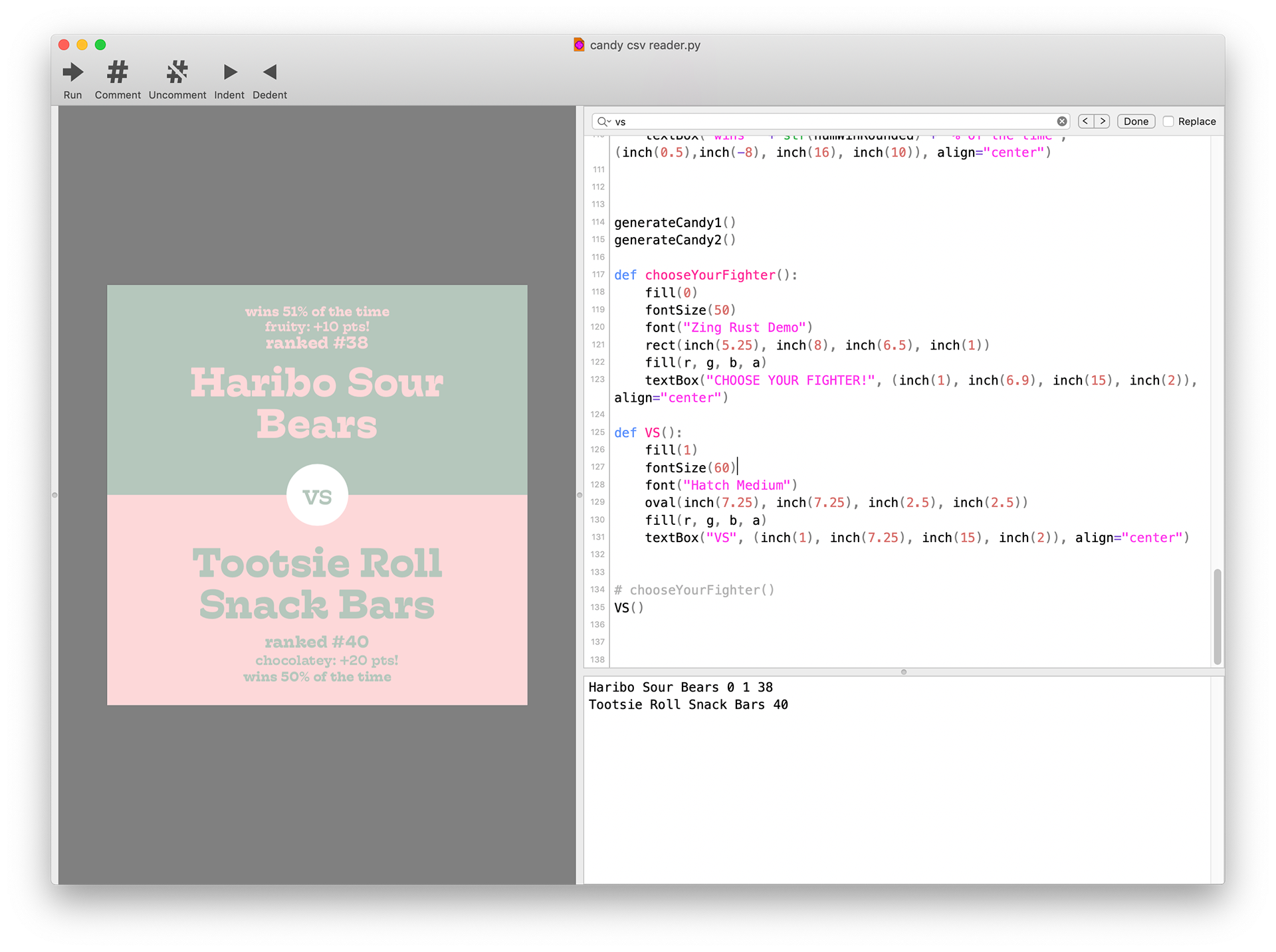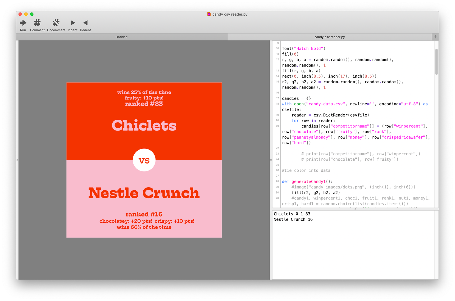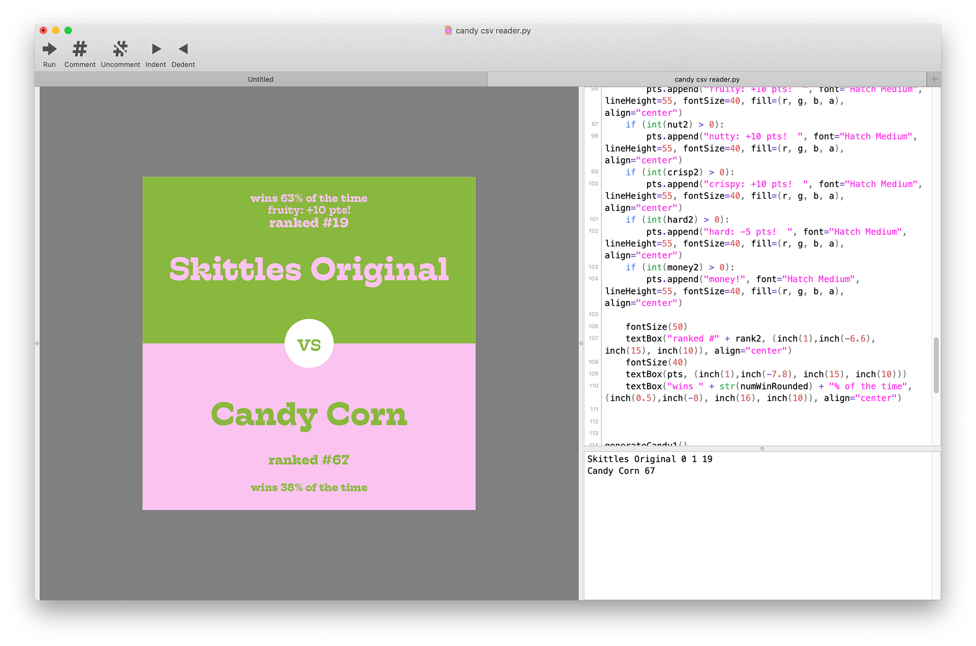 The code for this is uh… long, so here’s the part where it parses the .CSV file. It then takes this data, picks two candies, and shows each candy’s stats on their respective sides. April 2020