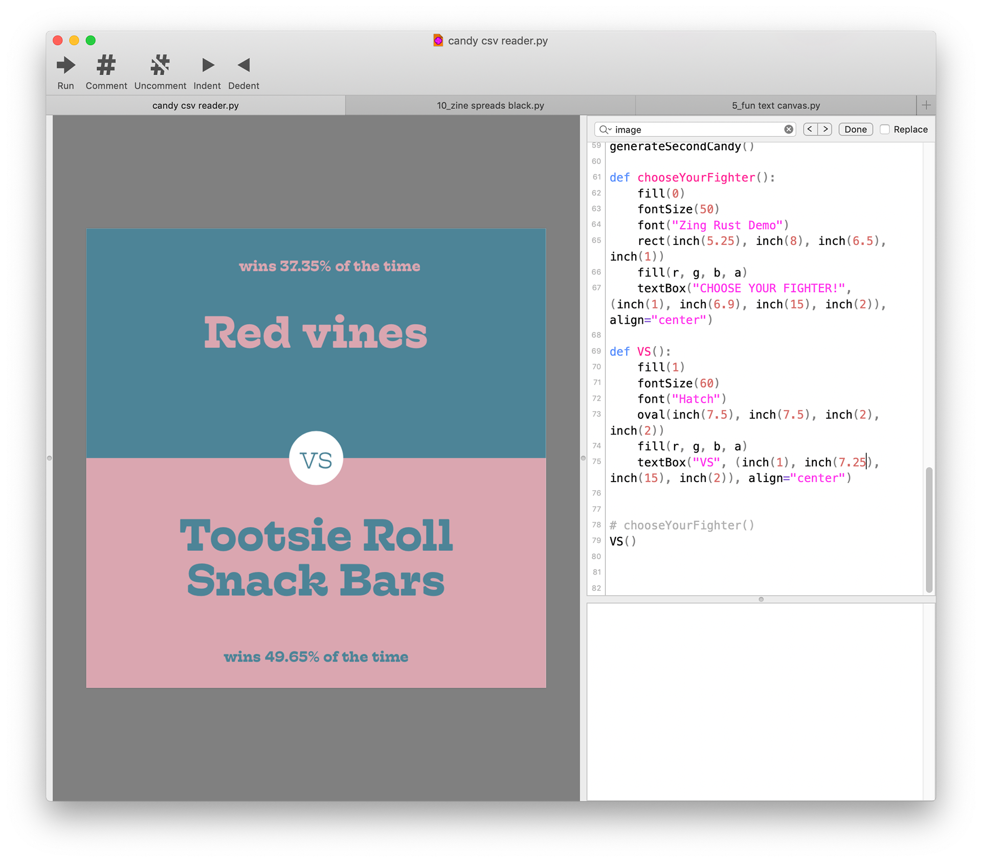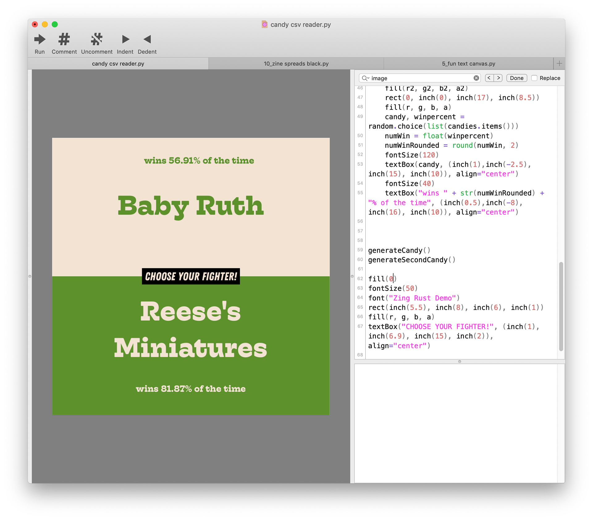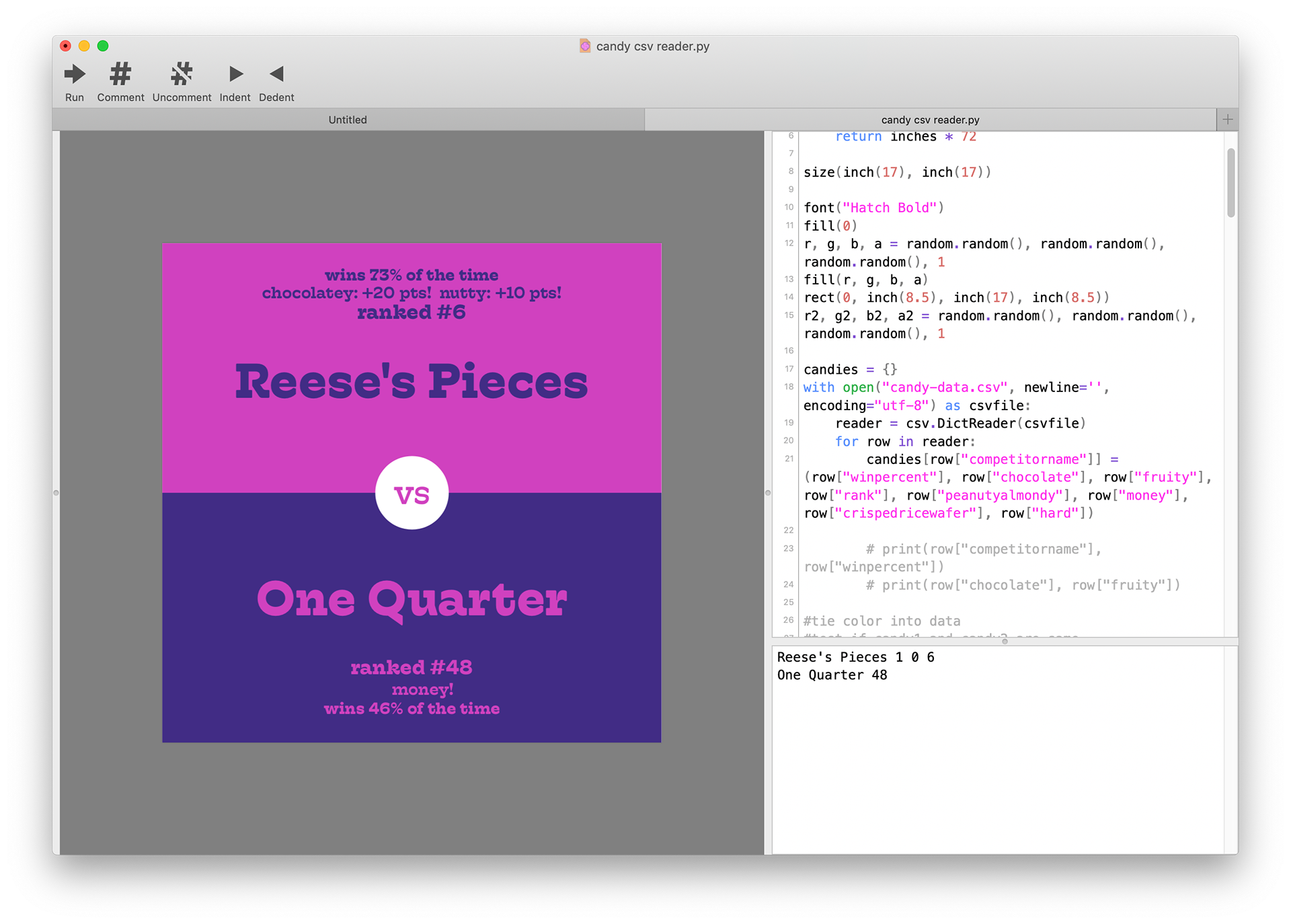 The code for this is uh… long, so here’s the part where it parses the .CSV file. It then takes this data, picks two candies, and shows each candy’s stats on their respective sides. April 2020